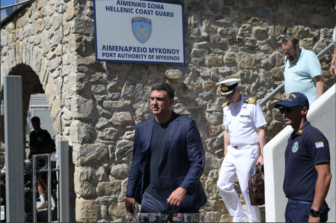 Ο Υπουργός, ο οποίος συνοδευόταν από τον Γενικό Γραμματέα Ναυτιλίας και Λιμένων, Ευάγγελο Κυριαζόπουλο και τον Γενικό Επιθεωρητή του Λ.Σ. – ΕΛ.ΑΚΤ., Υποναύαρχο Λ.Σ. Χρήστο Παπακωνσταντίνου, επισκέφθηκε το Λιμεναρχείο Μυκόνου όπου ενημερώθηκε από τον Διοικητή της 6ης ΠΕ.ΔΙ.Λ.Σ, Αρχιπλοίαρχο Λ.Σ. Παναγιώτη Καραμήτσα και τον Λιμενάρχη, Αντιπλοίαρχο Λ.Σ. Παναγιώτη Κατσάρα, για θέματα που αφορούν στη δραστηριότητα της Περιφέρειας και του Λιμεναρχείου και συζήτησε με τα στελέχη της Λιμενικής Αρχής.