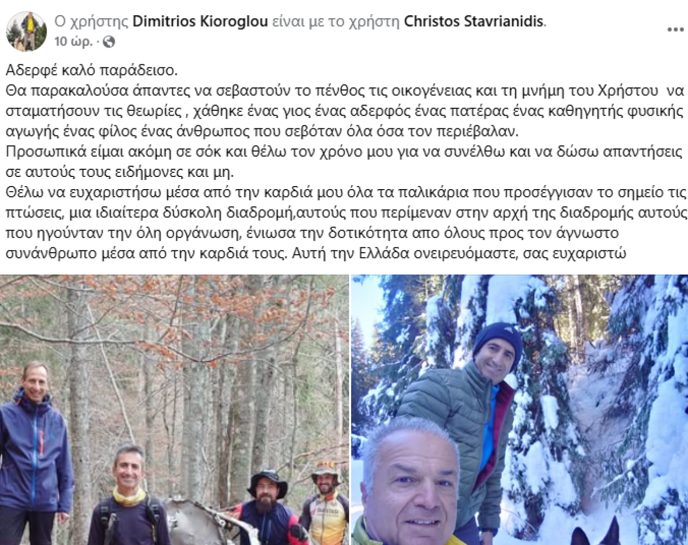 Ο Δημήτρης ήταν παρών όταν, όπως περιγράφει, δέχτηκαν επίθεση από μια αρκούδα, η οποία, κατά τα λεγόμενά του, ήταν υπεύθυνη για την πτώση του άτυχου ορειβάτη στη χαράδρα, όπου βρέθηκε αναίσθητος. Στην ανάρτησή του, ο κ. Κιορόγλου ζητά «σεβασμό στο πένθος της οικογένειας και στη μνήμη του Χρήστου» και καλεί «να σταματήσουν οι θεωρίες».