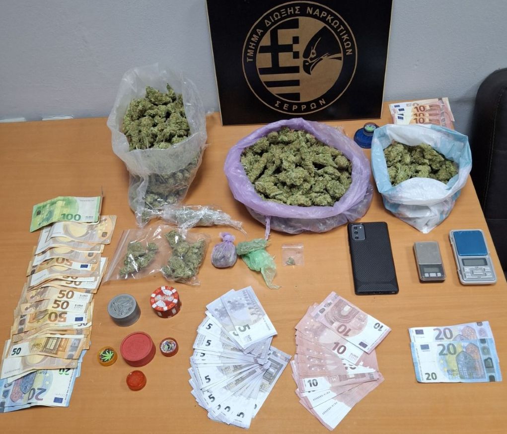 Σε έρευνα των αστυνομικών στο σπίτι του, βρέθηκαν οκτώ συσκευασίες με ακατέργαστη κάνναβη, συνολικού βάρους 1 κιλού και 102,86 γραμμαρίων, δύο ηλεκτρονικές ζυγαριές ακριβείας, έξι τρίφτες με υπολείμματα ακατέργαστης κάνναβης, το χρηματικό ποσό των 1.400 ευρώ και 153 εμφανώς πλαστά χαρτονομίσματα των 5, των 10 και των 20 ευρώ.