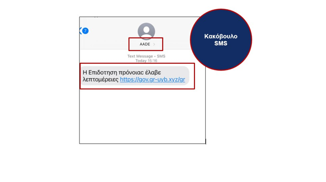 Συνεπώς, αγνοήστε οποιοδήποτε τέτοιο μήνυμα λάβατε ή τυχόν λάβετε στο κινητό σας τηλέφωνο χωρίς να έχετε εσείς υποβάλει προηγουμένως σχετικό αίτημα στην ΑΑΔΕ και ΜΗΝ πατήσετε τον οποιοδήποτε σύνδεσμο (url link).
