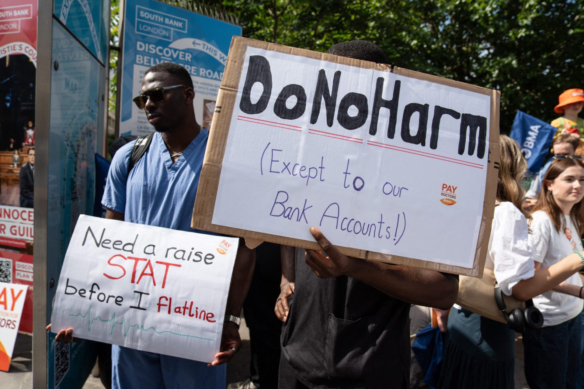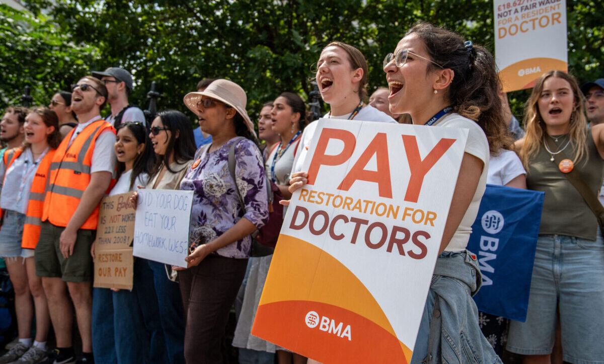 Χιλιάδες γιατροί στο κρατικά χρηματοδοτούμενο σύστημα υγείας της Αγγλίας αποχώρησαν από την εργασία τους την Παρασκευή (25/7). Ξεκίνησαν πενθήμερη απεργία για τις αμοιβές, την οποία η κυβέρνηση υποστηρίζει ότι θα πλήξει τη φροντίδα ασθενών πανεθνικά.