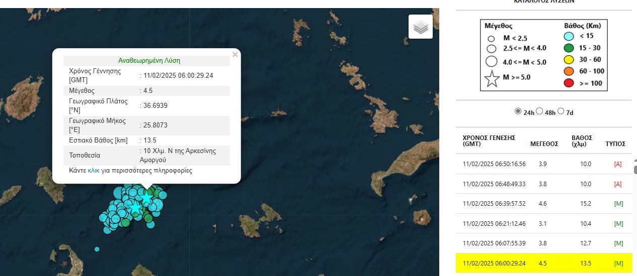 Αλλεπάλληλες σεισμικές δονήσεις στις Κυκλάδες με 4,5 Ρίχτερ, 4,6 και 4 Ρίχτερ σε μία ώρα