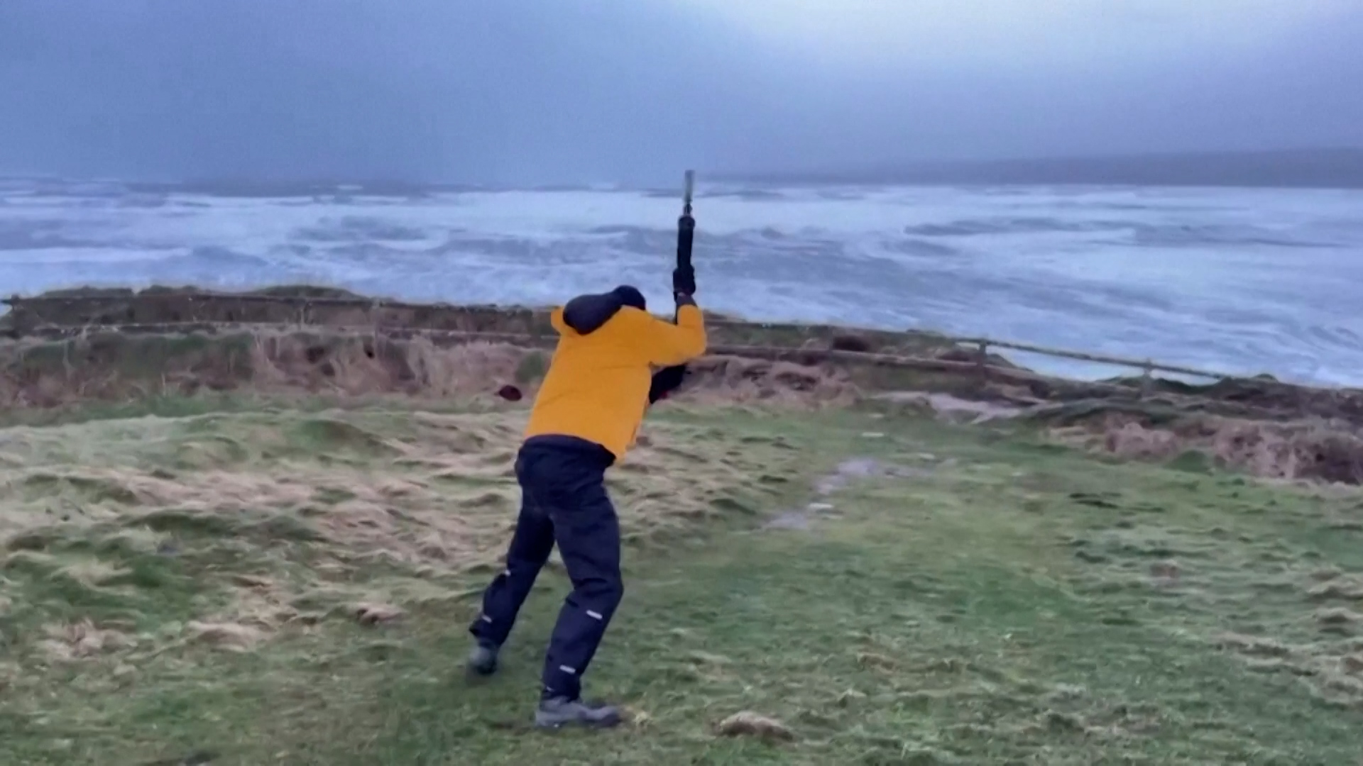Ένα μέλος της μετεωρολογικής εταιρείας Weather & Radar περπατάει με φανερή δυσκολία κόντρα στον άνεμο, καθώς συλλέγει δεδομένα για την ταχύτητα του ανέμου στην ακτή Co. Clare της Ιρλανδίας, κατά τη διάρκεια της καταιγίδας Eowyn το πρωί της Παρασκευής.