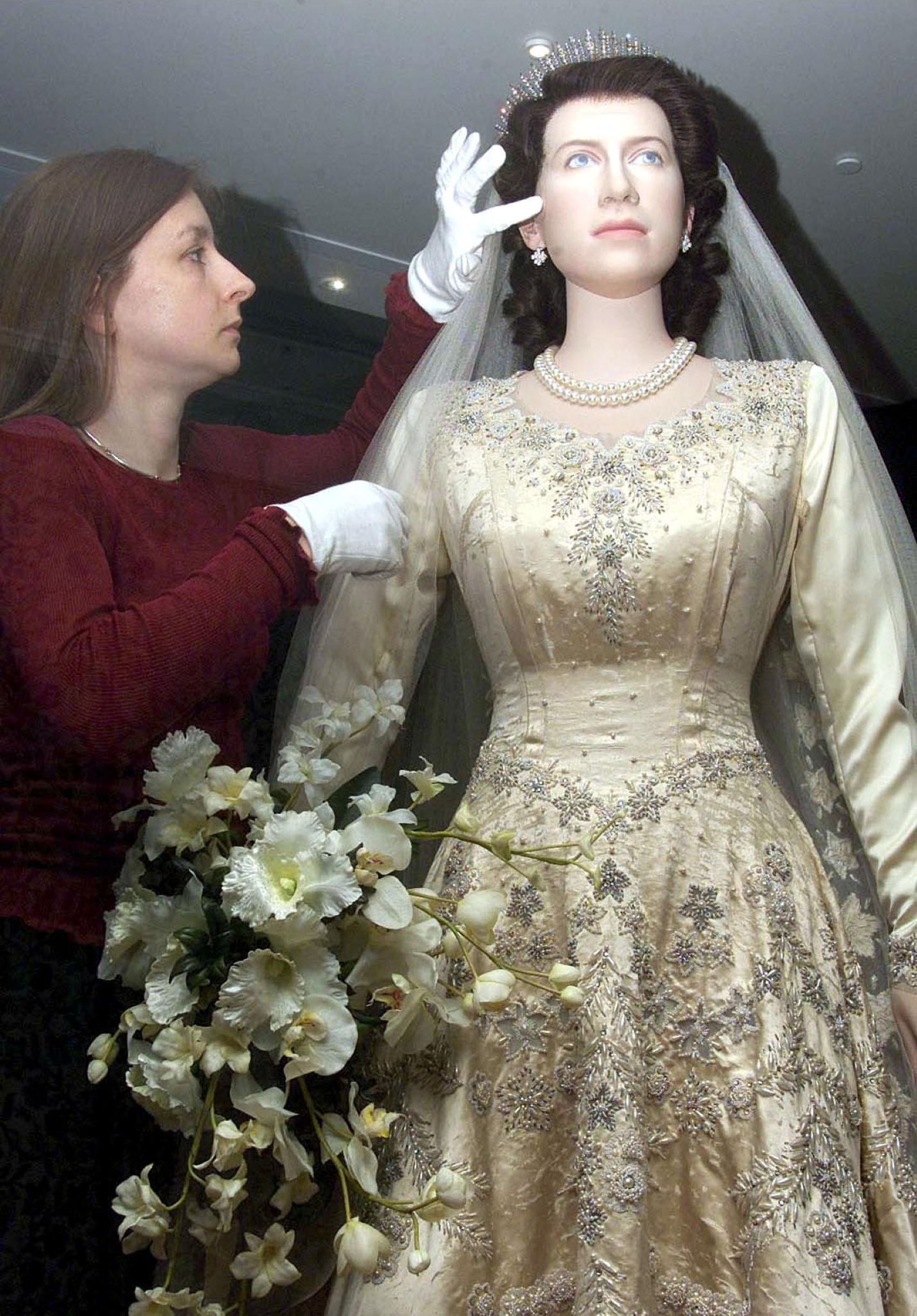 Σχεδιασμένο από τον βασιλικό μόδιστρο Νόρμαν Χάρτνελ (Norman Hartnell), το κομψό σατέν φόρεμα χρειάστηκε 350 μοδίστρες, 10.000 εισαγόμενα μαργαριτάρια και μια σειρά από δελτία σίτισης για να υλοποιηθεί.