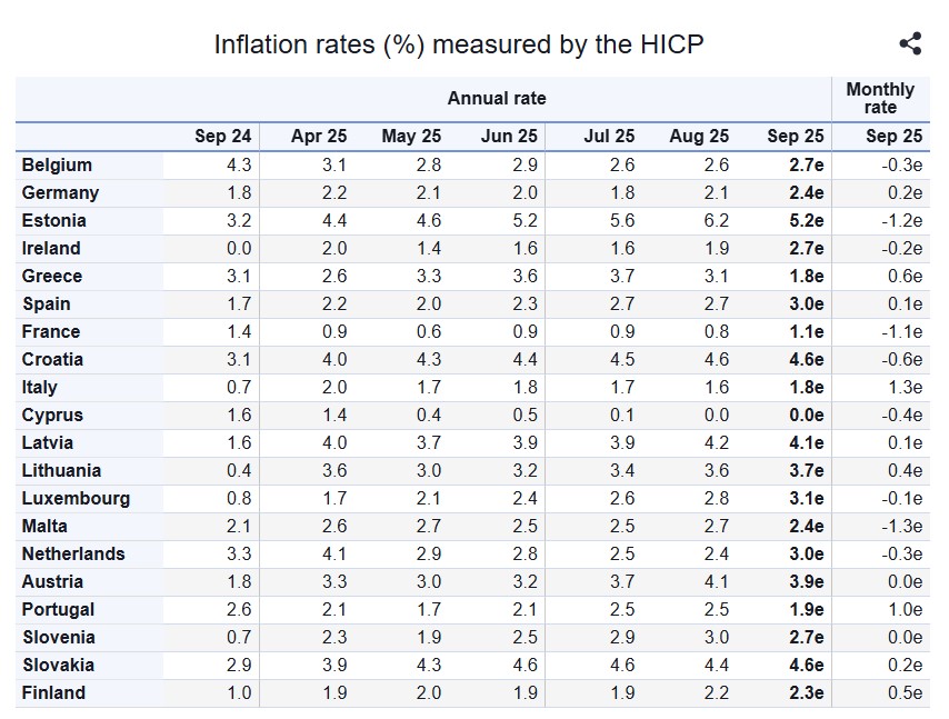 Ο ετήσιος πληθωρισμός στην ευρωζώνη αναμένεται να ανέλθει σε 2,2% τον Σεπτέμβριο του 2025, από 2,0% τον Αύγουστο, σύμφωνα με μια προκαταρκτική εκτίμηση της Eurostat, της στατιστικής υπηρεσίας της Ευρωπαϊκής Ένωσης.