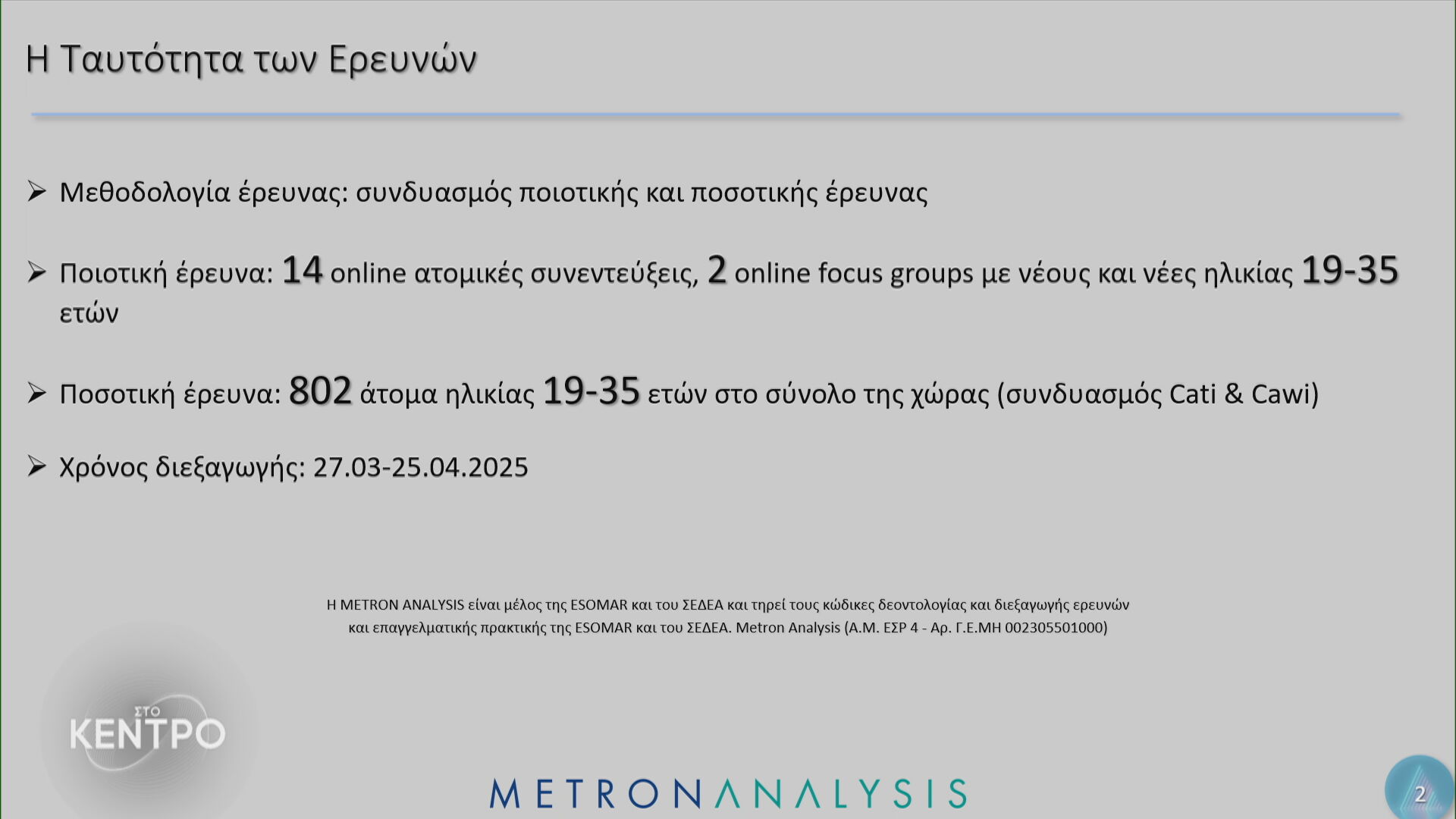 Τα στοιχεία για τη γήρανση του πληθυσμού τρομάζουν, σύμφωνα την έρευνα της Metron Analysis για το Δημογραφικό που παρουσιάστηκε στην εκπομπή του ΕΡΤNews «Στο Κέντρο» με τον Γιώργο Κουβαρά, που παρουσίασε ο πρόεδρος και Διευθύνων Σύμβουλος της εταιρείας Στράτος Φαναράς.