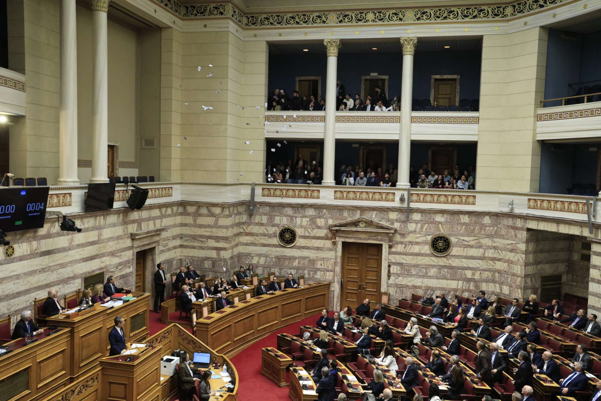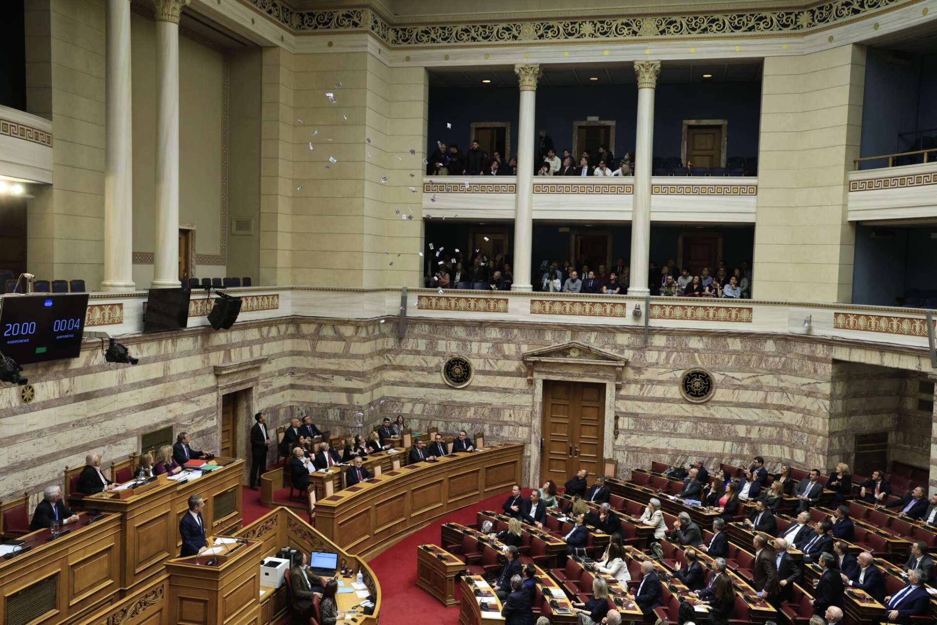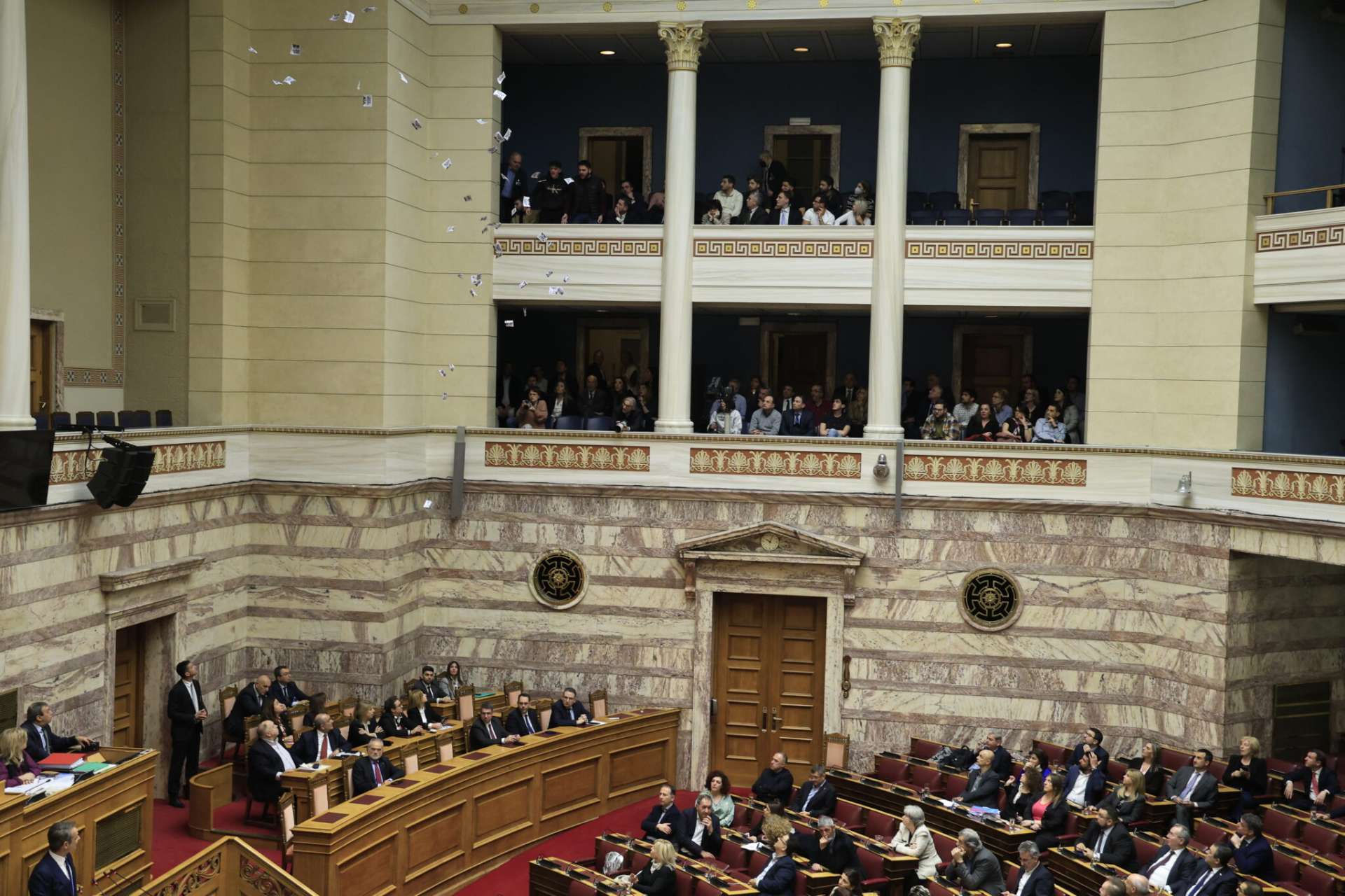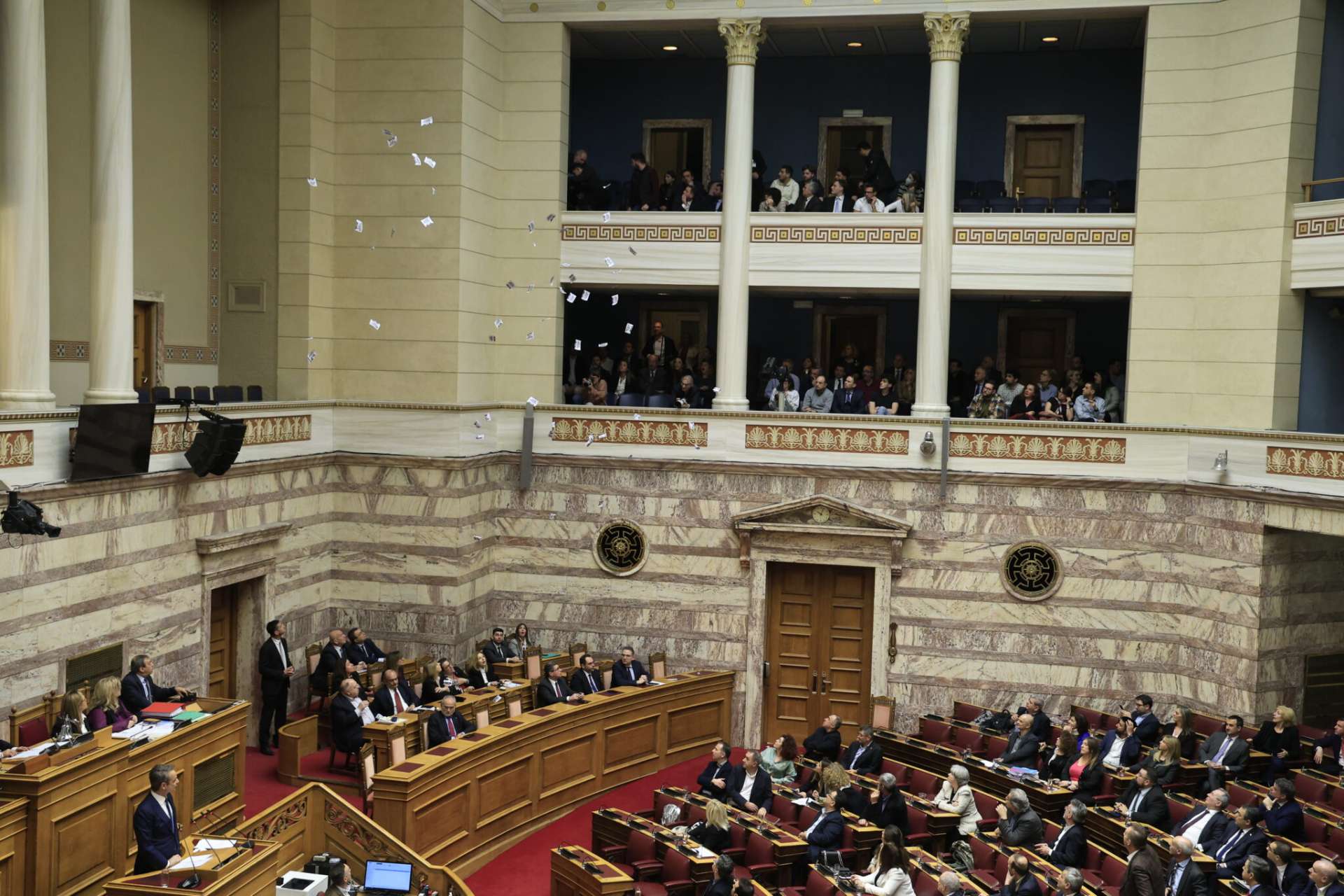 Διαδηλωτές που βρίσκονταν στα θεωρεία της Βουλής πέταξαν τρικάκια όταν στο βήμα και λίγο πριν ξεκινήσει την ομιλία του ο Πρωθυπουργός, Κυριάκος Μητσοτάκης.