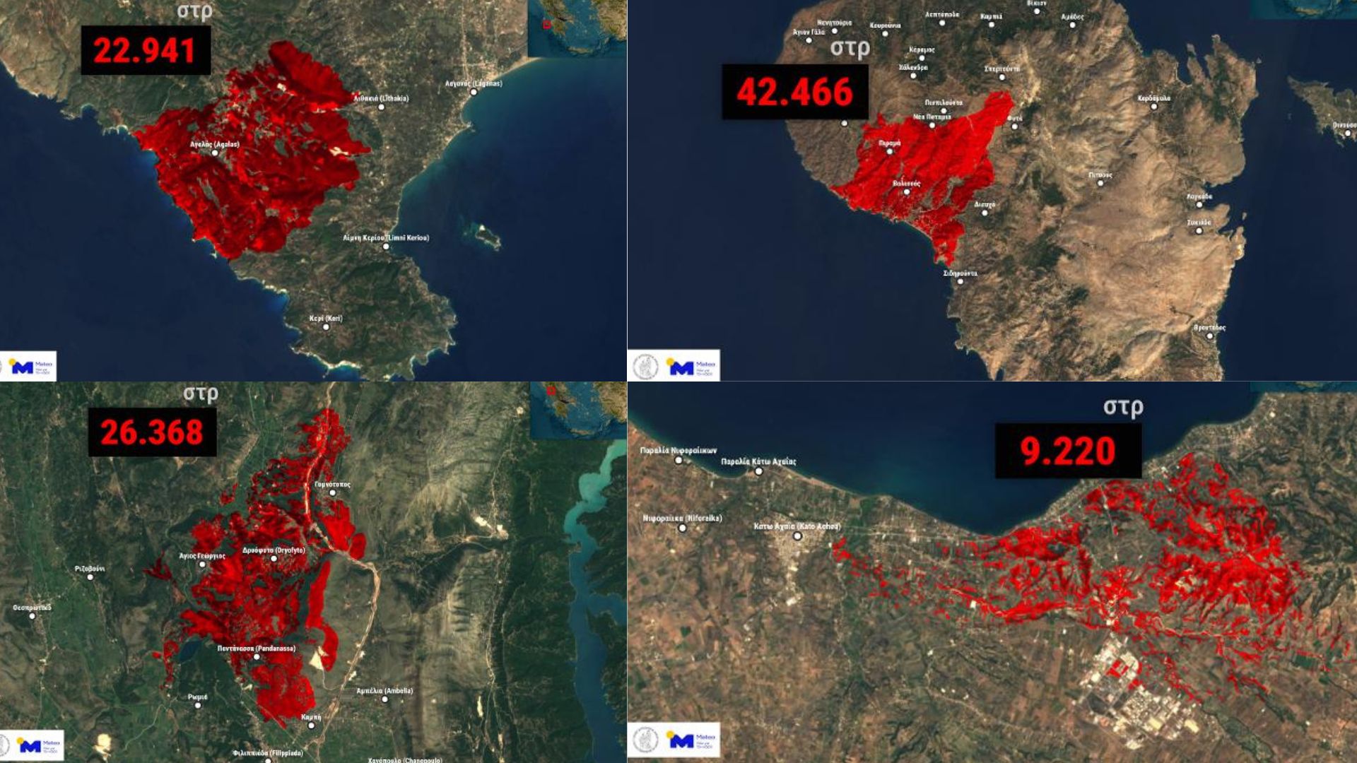 Περισσότερα από 100.000 στρέμματα έχουν γίνει στάχτη από τις καταστροφικές φωτιές που έπληξαν τη Χίο, τη Ζάκυνθο, την Πρέβεζα και την Αχαΐα από την αρχή της εβδομάδας, όπως φαίνεται από τα δεδομένα από δορυφόρους που επεξεργάστηκε η ομάδα του meteo.gr / Εθνικού Αστεροσκοπείου Αθηνών.