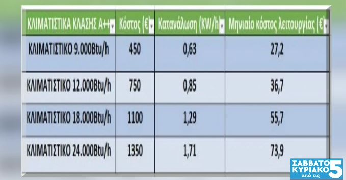 - για κλιματιστικό 18.000 BTU (8 ώρες/ημέρα) θα πληρώσουμε 55 € / μήνα