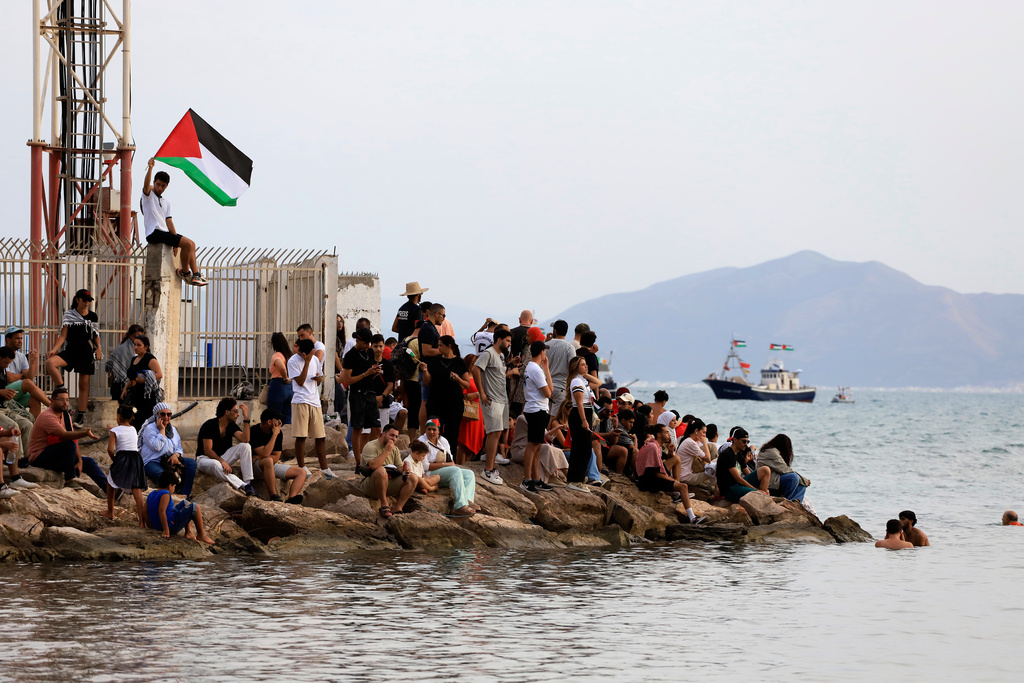 Tunisian people chant in support of the the Global Sumud Flotilla as it arrives at the port of Sidi Bou Saïd, in Tunis, Tunisia, Sunday, Sept. 7, 2025. (AP Photo/Anis Mili)