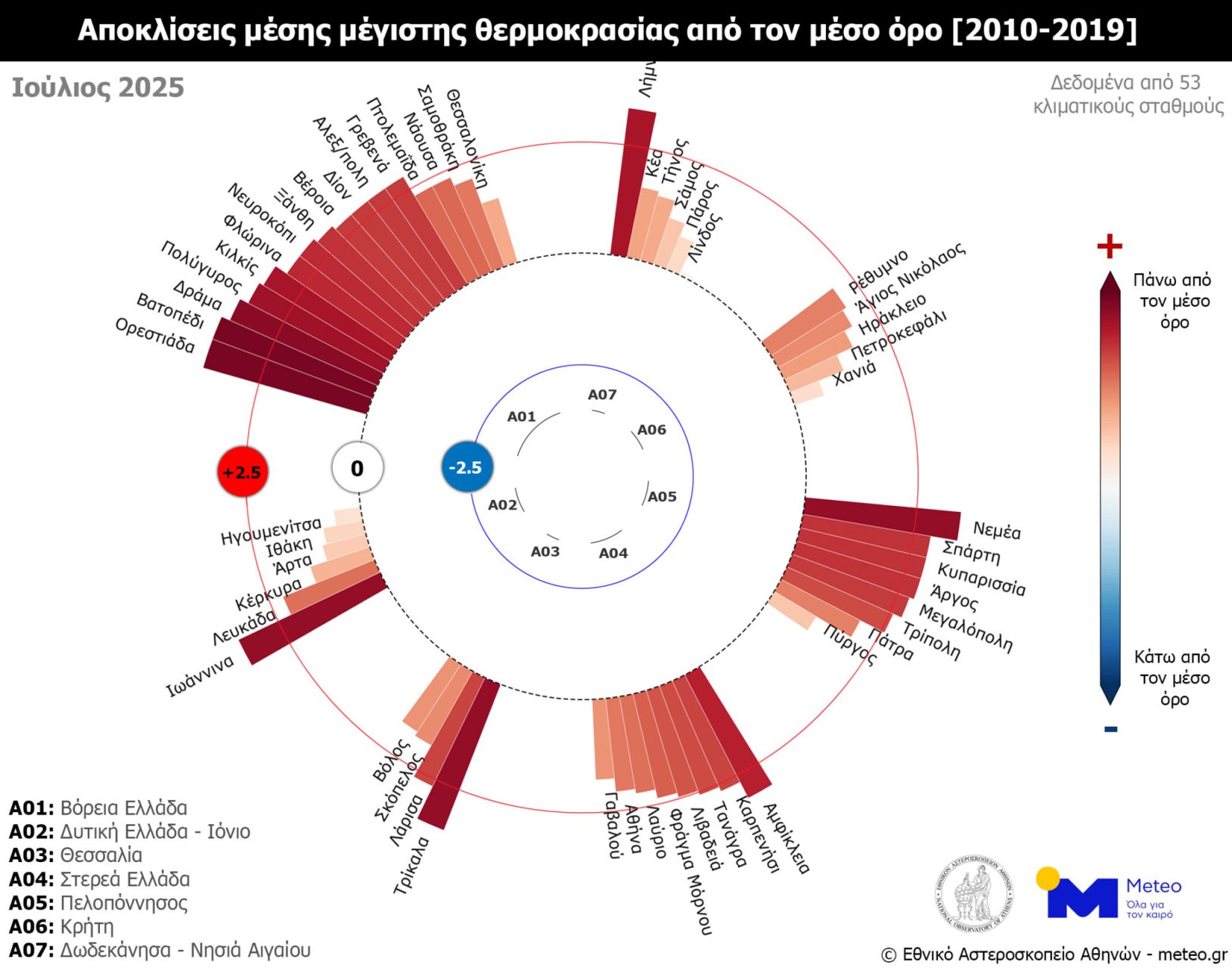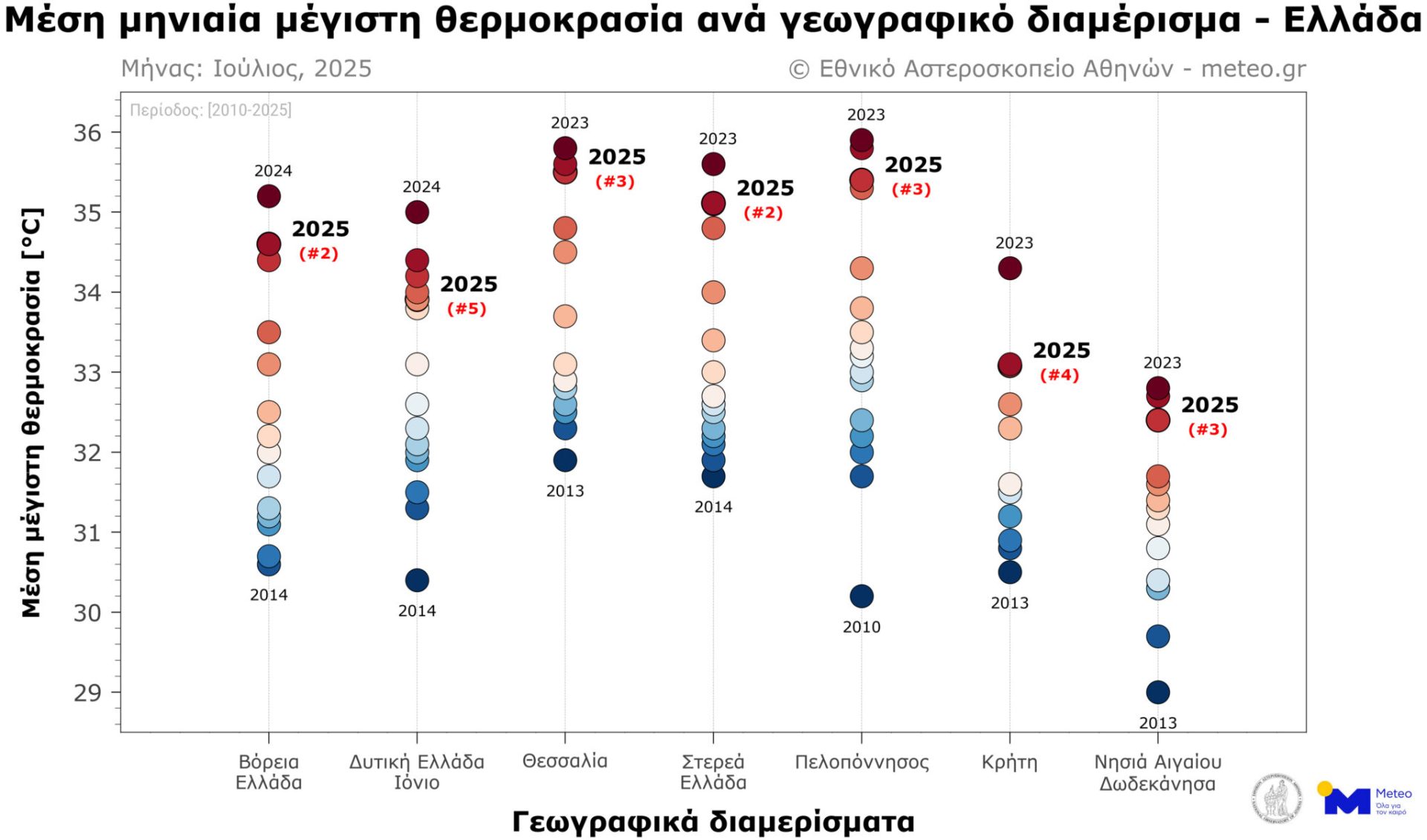 Ενδεικτικά, στη Βόρεια και τη Στερεά Ελλάδα, ο Ιούλιος 2025 ήταν ο 2ος θερμότερος από το 2010, στη Θεσσαλία, στην Πελοπόννησο και στα Νησιά Αιγαίου & Δωδεκάνησα ο 3ος θερμότερος, ενώ στην Κρήτη και στη Δυτική Ελλάδα & Ιόνιο ο 4ος και ο 5ος θερμότερος, αντίστοιχα, από το 2010.
