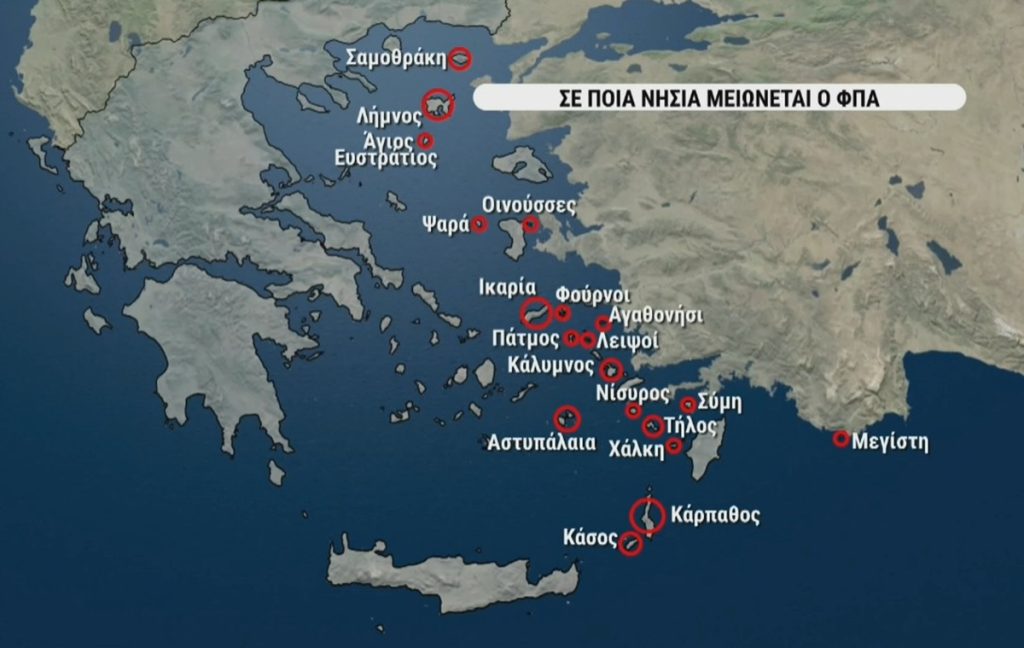 - Η μείωση κατά 30% του ΦΠΑ στα νησιά της Περιφέρειας Βόρειου Αιγαίου, του Νομού Έβρου και του νομού Δωδεκανήσων με πληθυσμό έως 20.000 κατοίκους,
