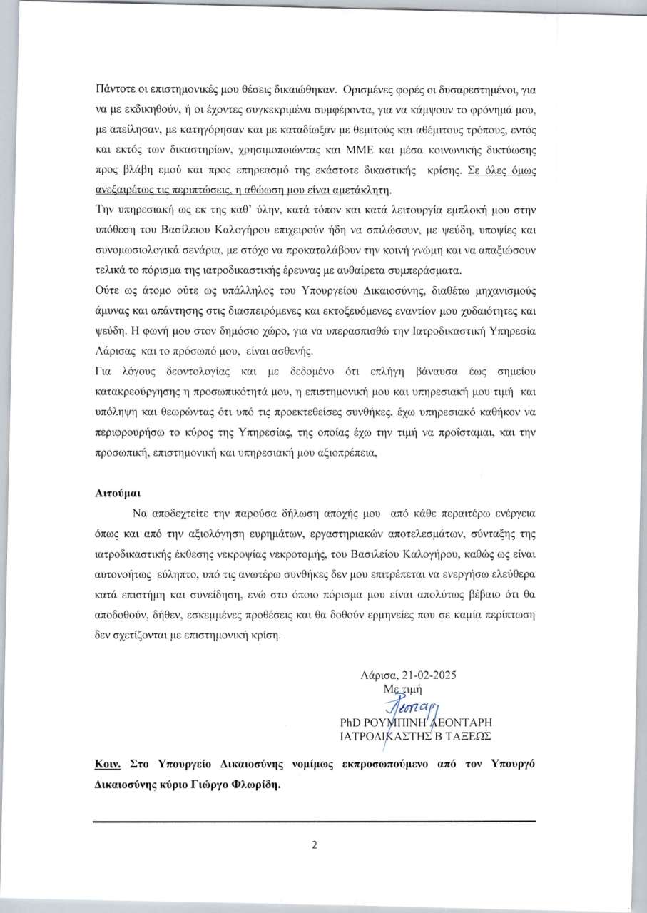 Η ίδια μιλά για «συνωμοσιολογικά σενάρια» στη σκιά του θανάτου του 39χρονου Βασίλη Καλογήρου, υπογραμμίζοντας ότι «η φωνή μου στον δημόσιο χώρο, για να υπερασπισθώ την Ιατροδικαστική Υπηρεσία Λάρισας και το πρόσωπό μου, είναι ασθενής». «Έχω υπηρεσιακό καθήκον να περιφρουρήσω το κύρος της Υπηρεσίας, της οποίας έχω την τιμή να προΐσταμαι, και την προσωπική, επιστημονική και υπηρεσιακή μου αξιοπρέπεια», καταλήγει η κυρία Λεονταρή.