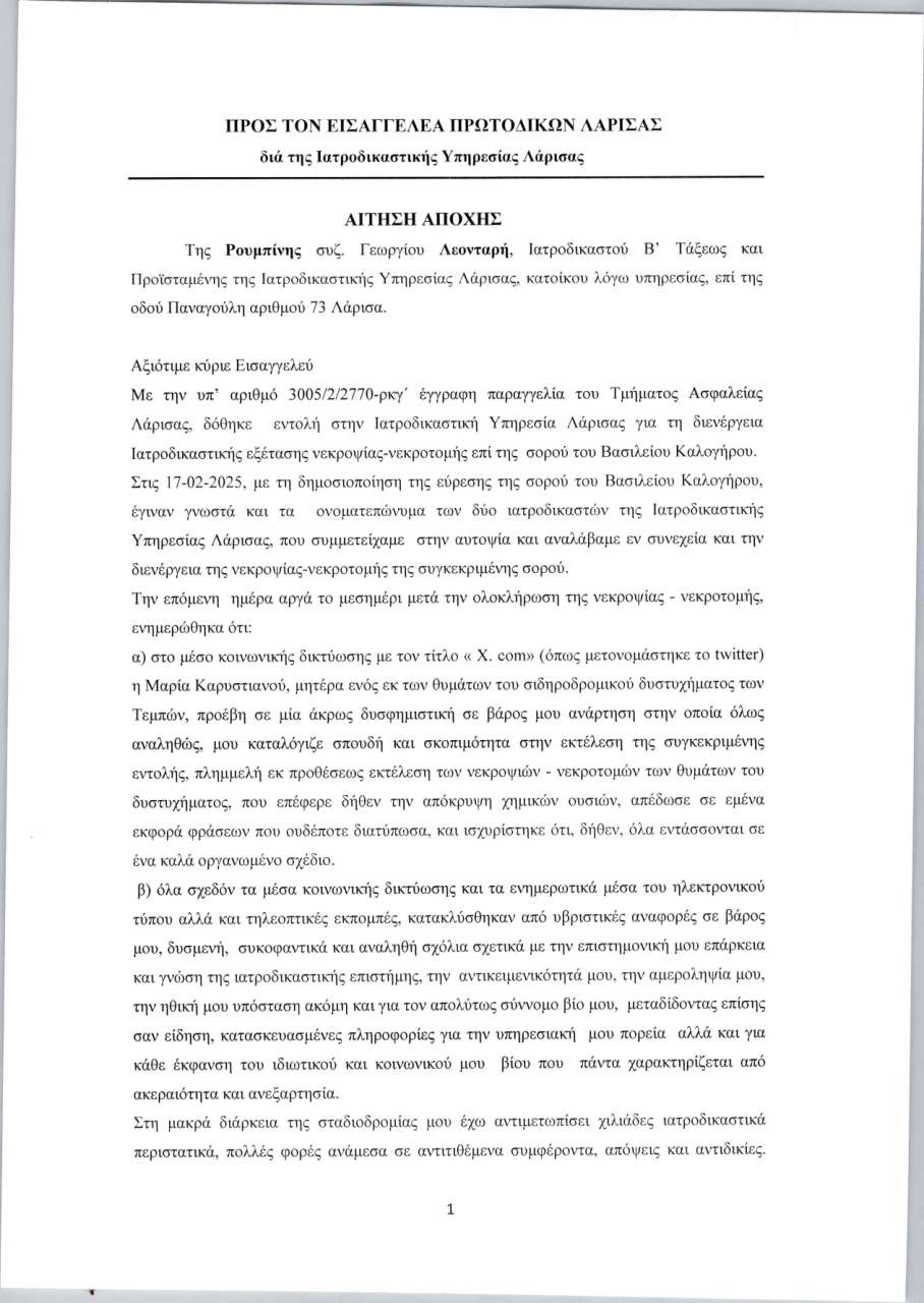 Η κυρία Λεονταρή ήταν η μία εκ των δύο ιατροδικαστών του Δημοσίου στην υπόθεση, ενώ και η οικογένεια έχει ορίσει από την πλευρά της, τεχνικό σύμβουλο. Επισήμως, δεν έχει γίνει γνωστό αν το αίτημα αποχής έχει υποβληθεί ήδη από την κυρία Λεονταρή.