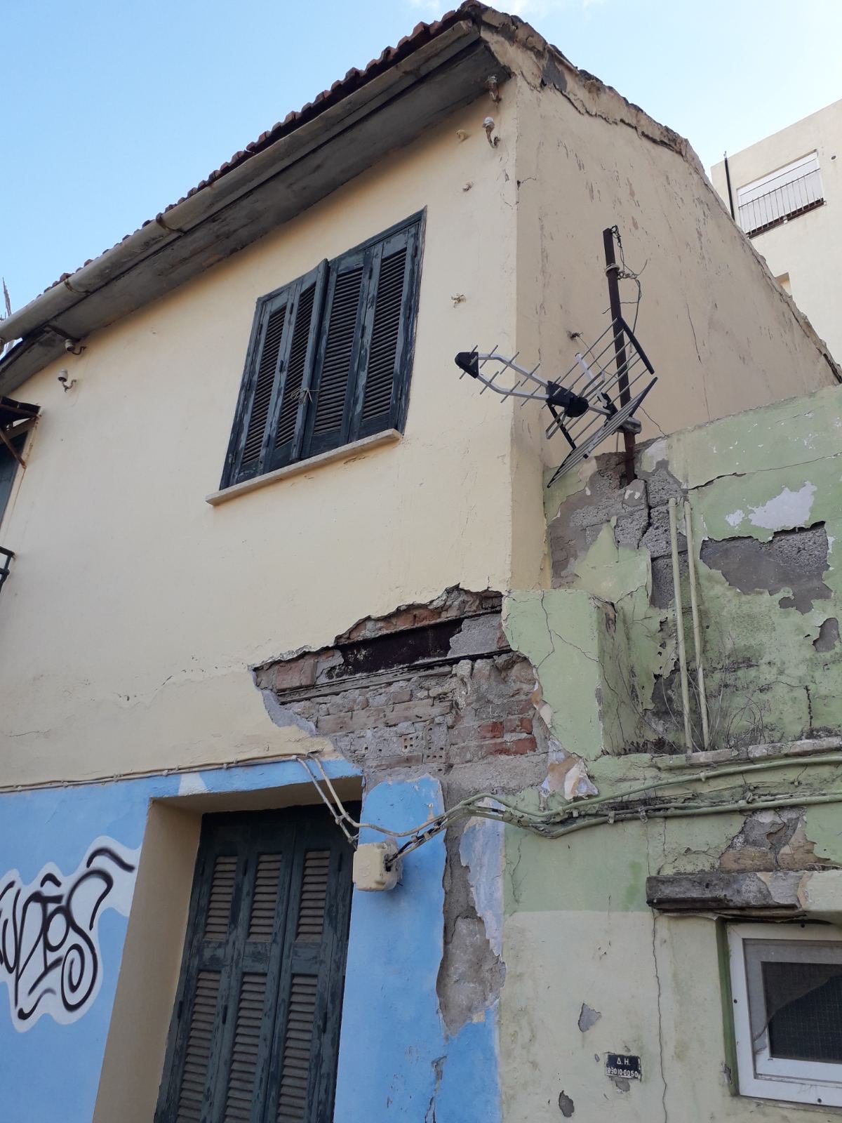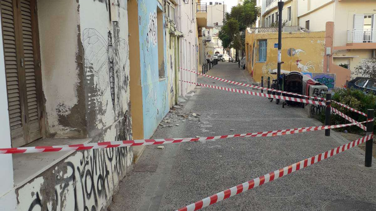 Το πρώτο περιστατικό αφορά αποκόλληση ενός τμήματος εξωτερικού τοίχου σε κτίσμα επί της οδού Γιαννίκου στην παλιά πόλη. Τα κομμάτια έπεσαν στο δρόμο, χωρίς ευτυχώς να υπάρξουν τραυματισμοί. Άμεσα βρέθηκαν στο σημείο μηχανικοί από την Πολεοδομία του δήμου Ηρακλείου προκειμένου να εκτιμήσουν την κατάσταση και να ελέγξουν το κτίριο, ενώ η Δημοτική Αστυνομία απέκλεισε το σημείο. Ο δρόμος έχει κλείσει για τα διερχόμενα οχήματα μέχρι να ολοκληρωθεί η αυτοψία των μηχανικών.