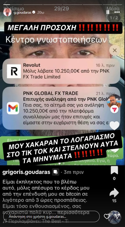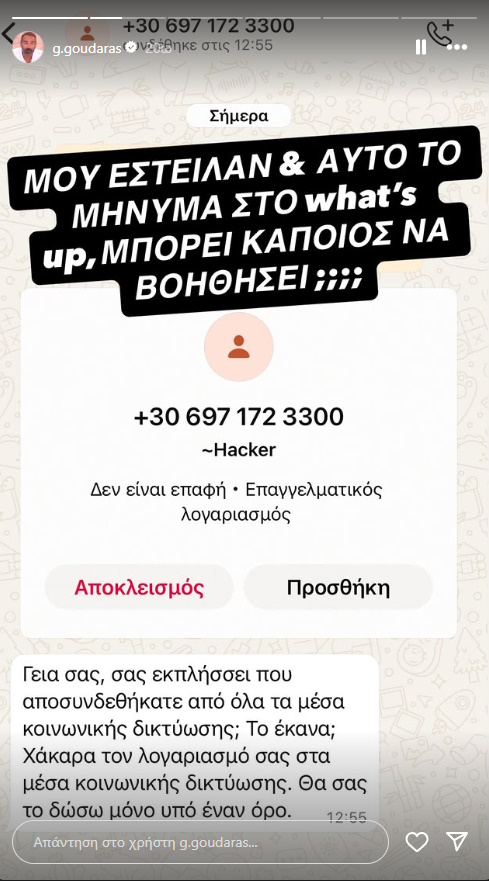 «Μου έστελναν κανονικό διάλογο με το σήμα του TikTok για το πώς μπορώ να ανακτήσω τον λογαριασμό μου. Ένας λογαριασμός στο What’sApp μου είπε: είμαστε οι χάκερς, για να πάρεις πίσω τον λογαριασμό σου πρέπει να κάνεις αυτά τα βήματα. Από τη Δίωξη μου είπαν να μη διανοηθώ να απαντήσω στο μήνυμα. Κι αυτό χακαρισμένο τηλέφωνο στο What’sApp ήταν. Μιλάμε για τρελά πράγματα, παιδιά», περιέγραψε αμέσως μετά ο Γρηγόρης Γκουντάρας στον αέρα του ΑΝΤ1.