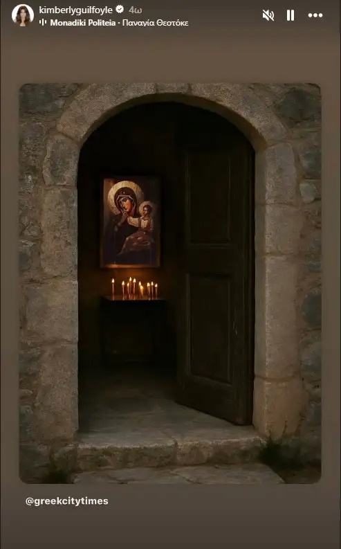 Παραμονή του Δεκαπενταύγουστου, λοιπόν, η Κίμπερλι Γκιλφόιλ ανέβασε στο Instagram την συγκεκριμένη εικόνα, ενώ από πίσω ακούγονταν ο ύμνος «Αγνή Παρθένε Δέσποινα» με την φωνή του Πέτρου Γαϊτάνου.
