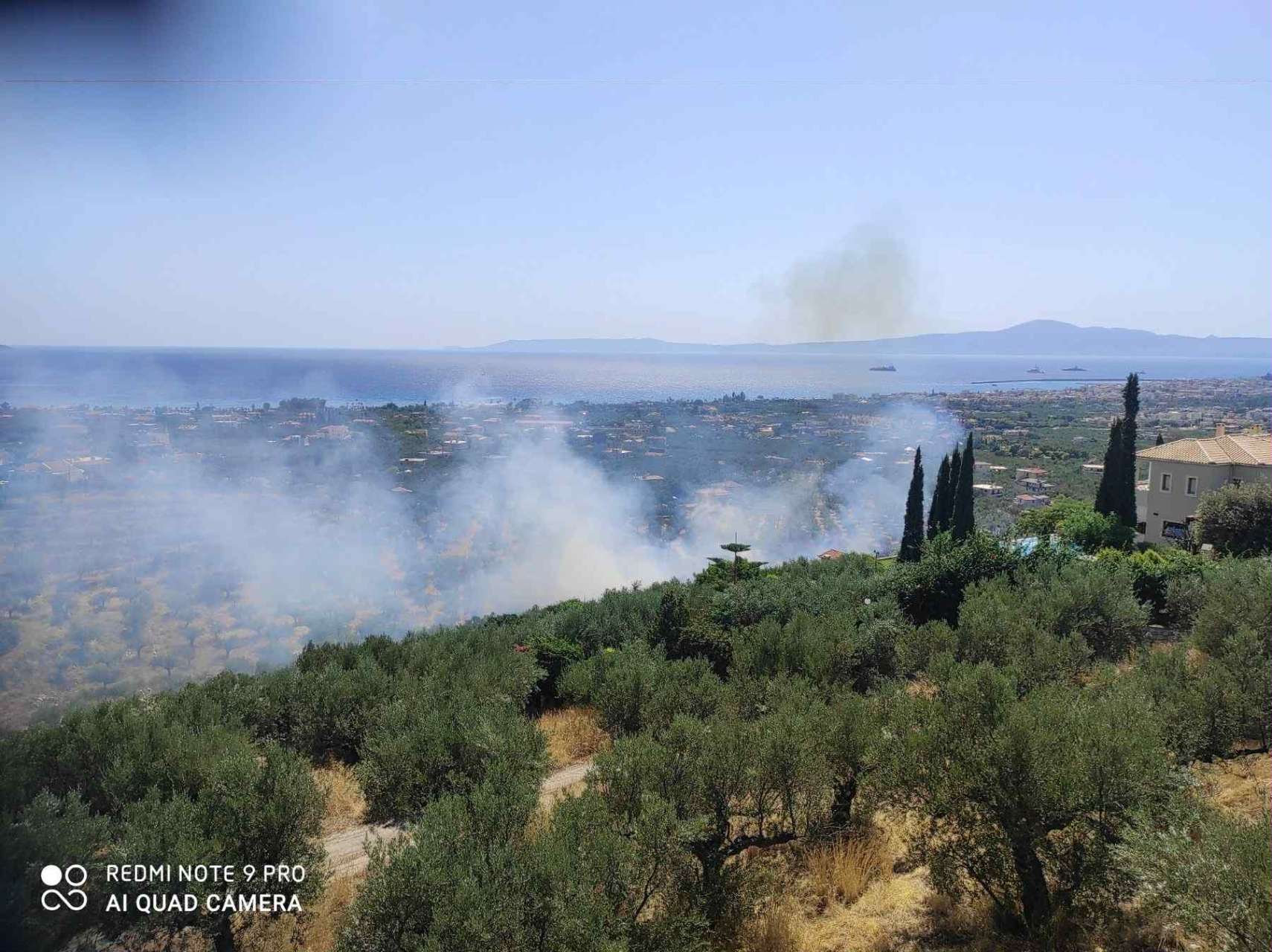 Η φωτιά έπιασε σε ξερά χόρτα και επεκτάθηκε σε χαράδρα όπου βρήκε καύσιμη ύλη. Βρίσκεται κοντά σε διάσπαρτες οικίες του οικισμού και γι’ αυτό το λόγο αλλά και εξαιτίας του δύσβατου σημείου επιχειρούν από αέρος και δυο α/φ τύπου PZL αλλά και ένα ελικόπτερο Ερικσον.