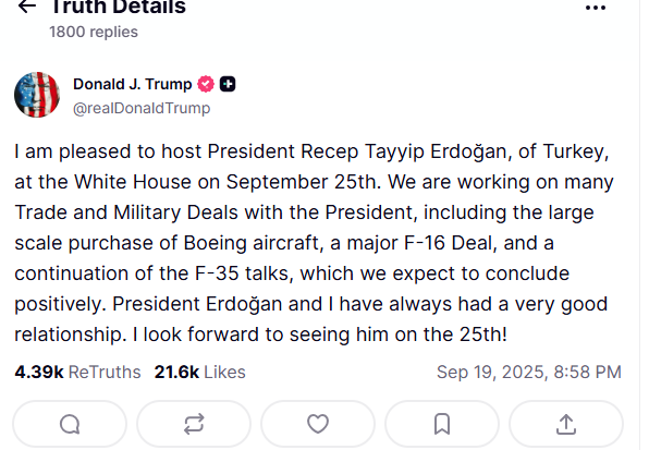 Την συνάντησή του με τον Ρετζέπ Ταγίπ Ερντογάν στον Λευκό Οίκο στις 25 Σεπτεμβρίου, ανακοίνωσε ο Nτόναλντ Tραμπ με ανάρτησή του στο Truth Social όπου αναφέρει: «Είμαι στην ευχάριστη θέση να υποδεχθώ τον Πρόεδρο της Τουρκίας, Ρετζέπ Ταγίπ Ερντογάν, στο Λευκό Οίκο στις 25 Σεπτεμβρίου. Συνεργαζόμαστε με τον Πρόεδρο σε πολλές εμπορικές και στρατιωτικές συμφωνίες, συμπεριλαμβανομένης της μεγάλης κλίμακας αγοράς αεροσκαφών Boeing, μιας σημαντικής συμφωνίας για τα F-16 και της συνέχισης των συνομιλιών για τα F-35, τις οποίες αναμένουμε να ολοκληρώσουμε με θετικό αποτέλεσμα. Ο Πρόεδρος Ερντογάν και εγώ έχουμε πάντα πολύ καλές σχέσεις. Ανυπομονώ να τον δω στις 25 του μήνα!»