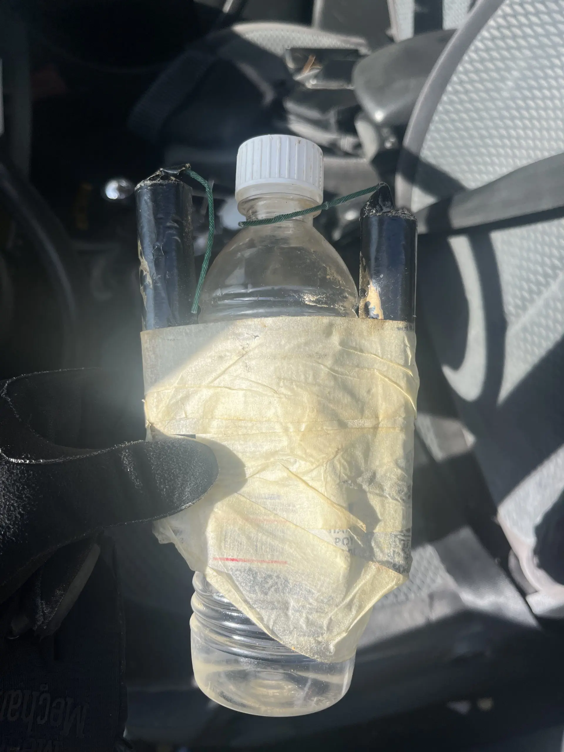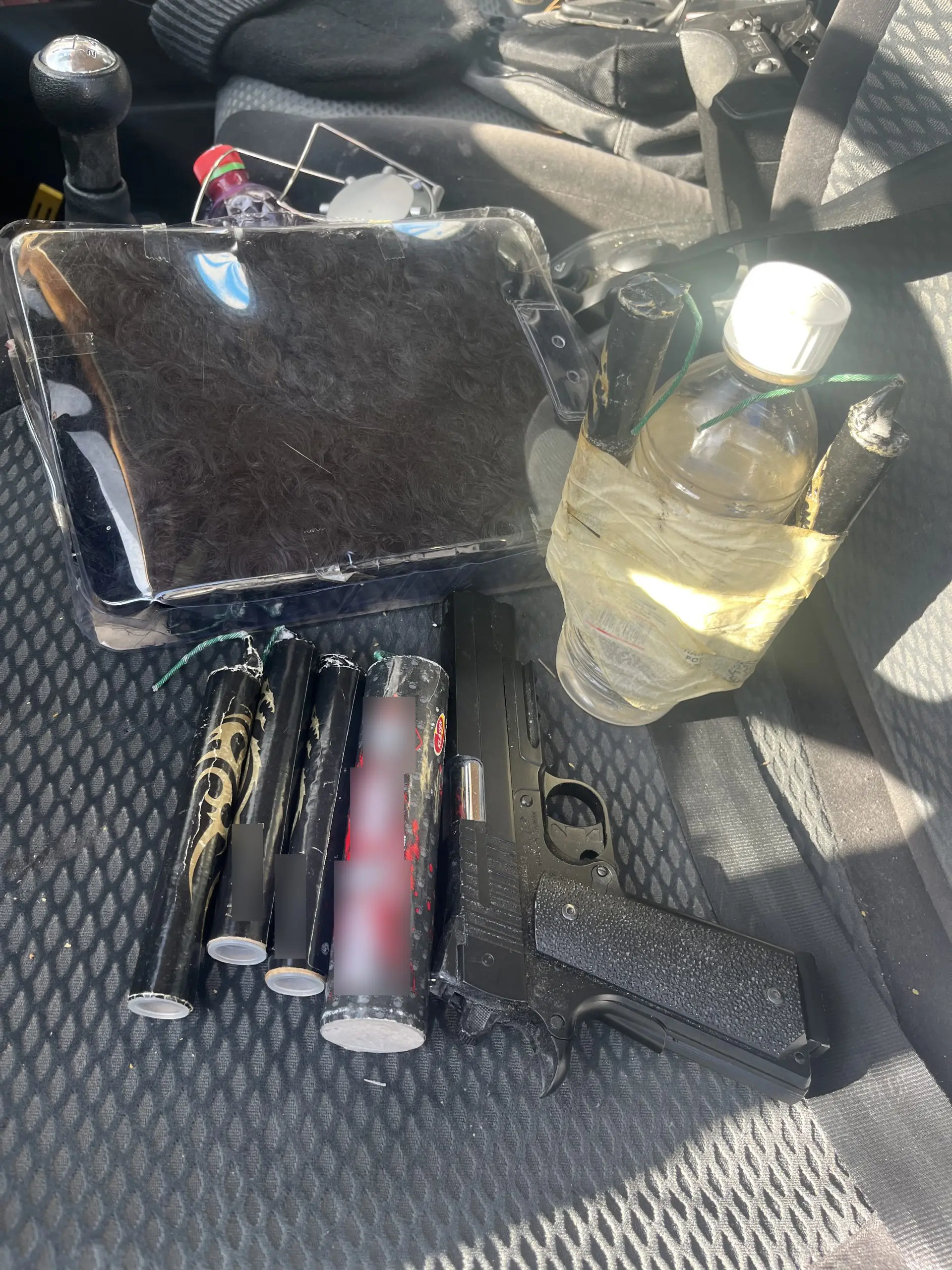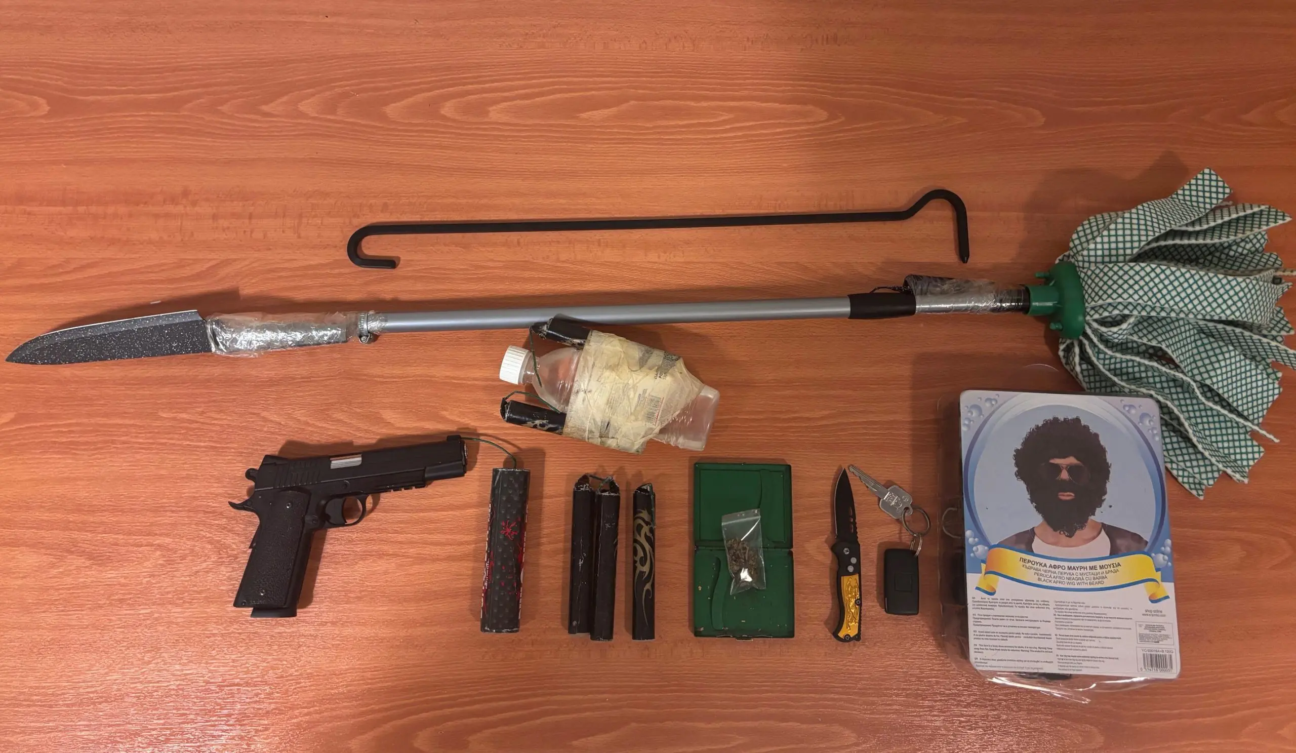 Σε επερχόμενο έλεγχο στην κατοχή του και στο εσωτερικό του οχήματος στο οποίο επέβαινε βρέθηκαν και κατασχέθηκαν αυτοσχέδιος εμπρηστικός μηχανισμός, αποτελούμενος από πλαστικό μπουκάλι με υγρό άγνωστης χημικής σύστασης και δύο κροτίδες τοποθετημένες γύρω από αυτό, αεροβόλο πιστόλι, 4 κροτίδες, αυτοσχέδια κατασκευή αποτελούμενη από σφουγγαρίστρα, στην άκρη της οποίας είχε τοποθετήσει μαχαίρι με κολλητική ταινία και στην άλλη άκρη κροτίδα, 1,15 γραμμ. κάνναβη, 14 φαρμακευτικά δισκία, αναδιπλούμενο μαχαίρι και περούκα.