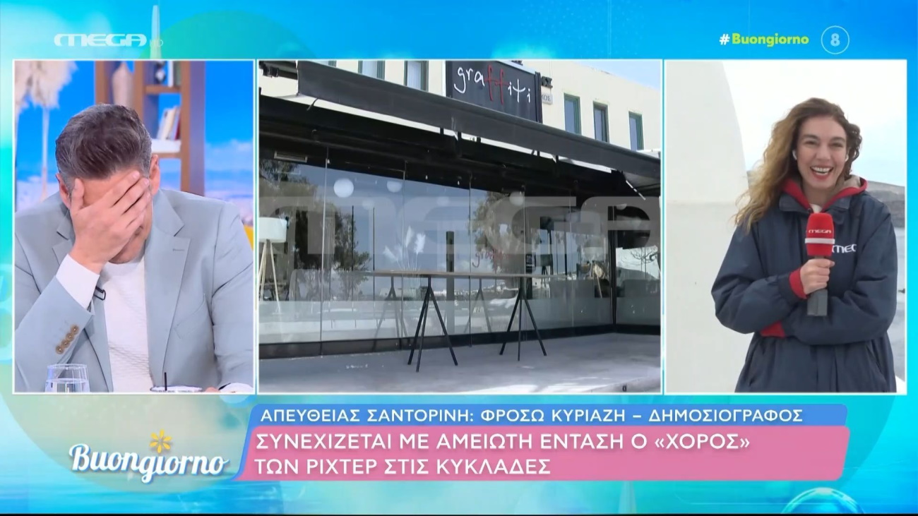 Απευθείας σύνδεση με την Σαντορίνη είχαν σήμερα στο Buongiorno, προκειμένου η δημοσιογράφος του Mega, Φρόσω Κυριαζή, να δώσει όλο το τελευταίο ρεπορτάζ.