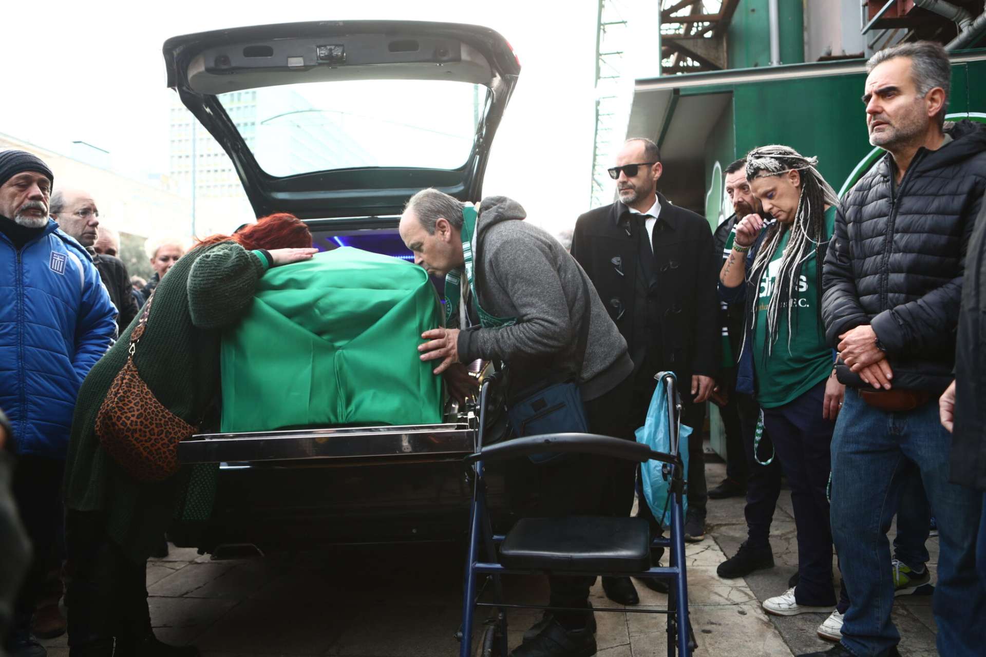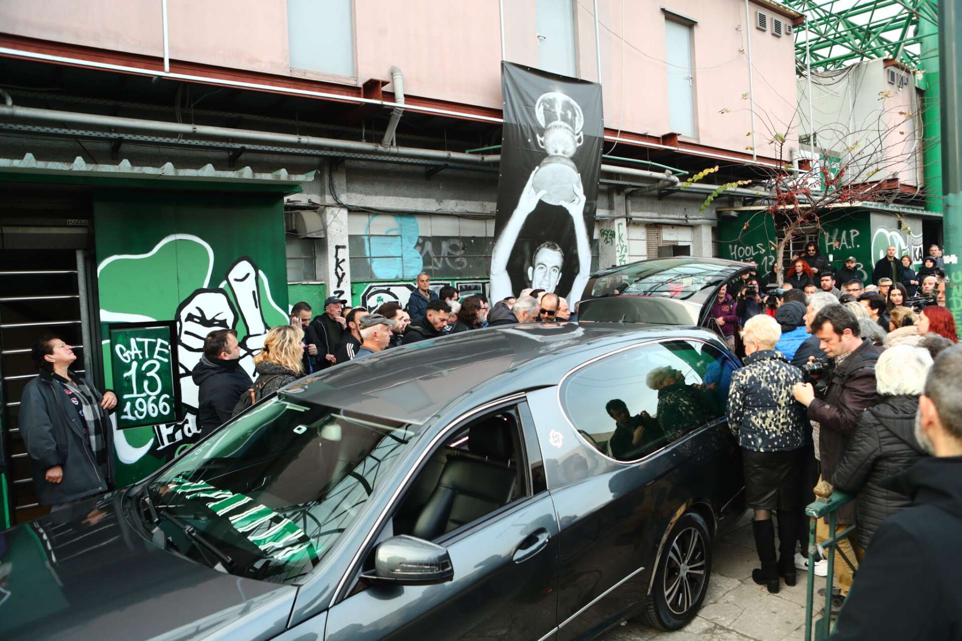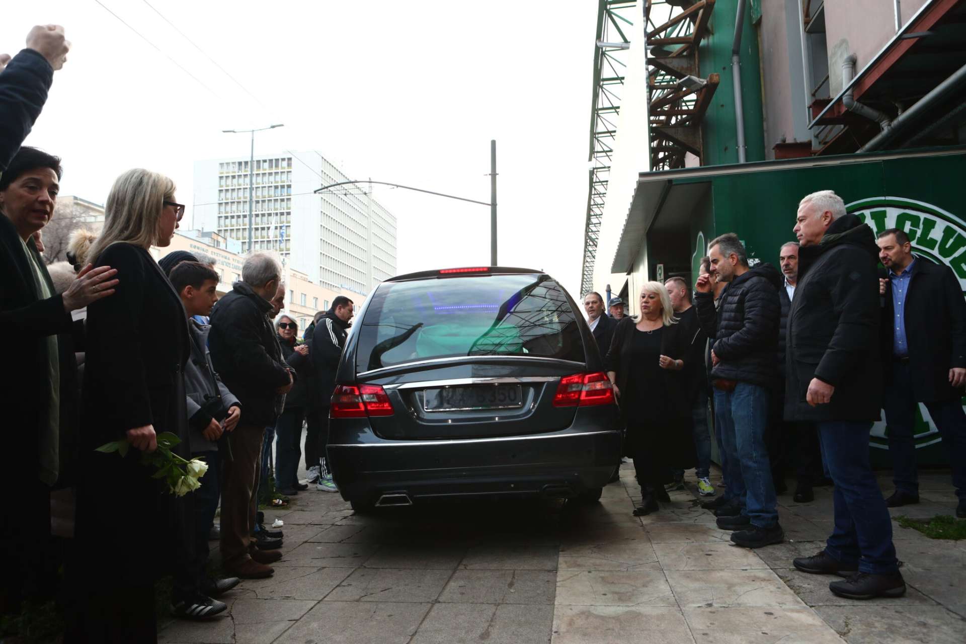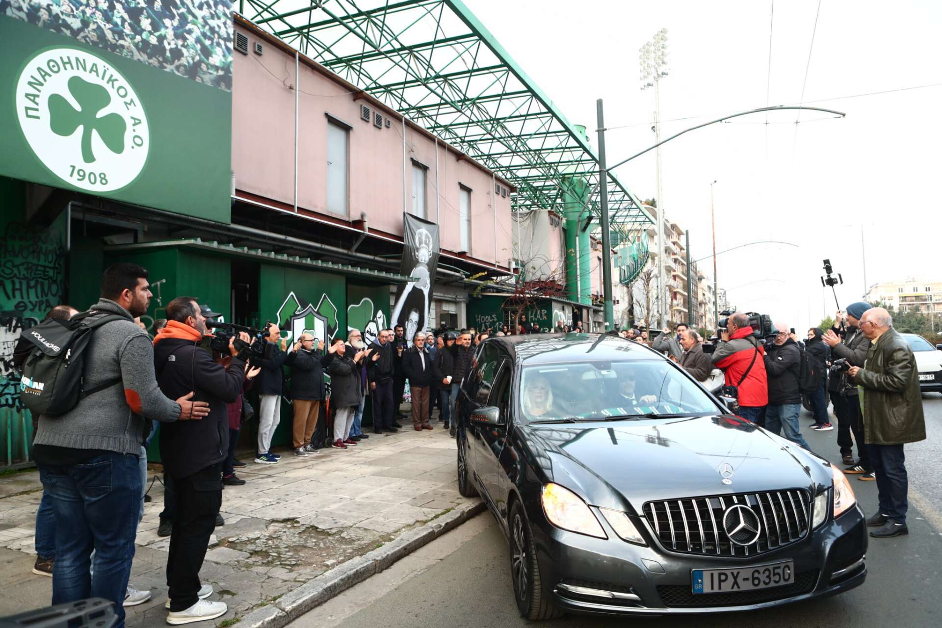 Η σορός του μεταφέρθηκε έξω από το γήπεδο της Λεωφόρου για μια τελευταία στάση λίγων λεπτών. Από τα μεγάφωνα του «Απόστολος Νικολαΐδης» ακουγόταν ο ύμνος του Παναθηναϊκού, ενώ στο μάτριξ βρισκόταν η εικόνα του «Στρατηγού». Εκεί τον περίμενε η κόρη του, Πόπη αλλά και φίλαθλοι, που θέλησαν να τον αποχαιρετήσουν, να αφήσουν ένα λουλούδι και να του πουν το τελευταίο αντίο.