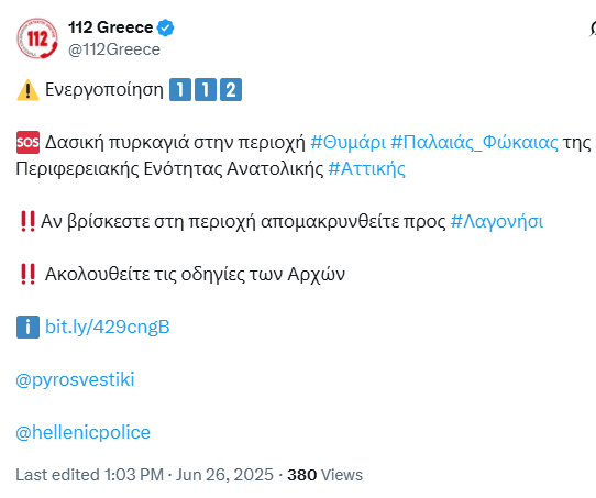 Φωτιά ξέσπασε το μεσημέρι της Πέμπτης (26/6) σε οικοπεδικό χώρο στην Παλαιά Φώκαια. Σύμφωνα με την ενημέρωση της Πυροσβεστικής, στο σημείο πηγαίνουν 21 οχήματα, ενώ ενεργοποιούνται και εναέρια μέσα. Το 112 ειδοποίησε άμεσα για την δασική πυρκαγιά στην περιοχή Θυμάρι της Παλαιάς Φώκαιας της Περιφερειακής Ενότητας Ανατολικής Αττικής και έδωσε οδηγία «αν βρίσκεστε στη περιοχή απομακρυνθείτε προς Λαγονήσι».