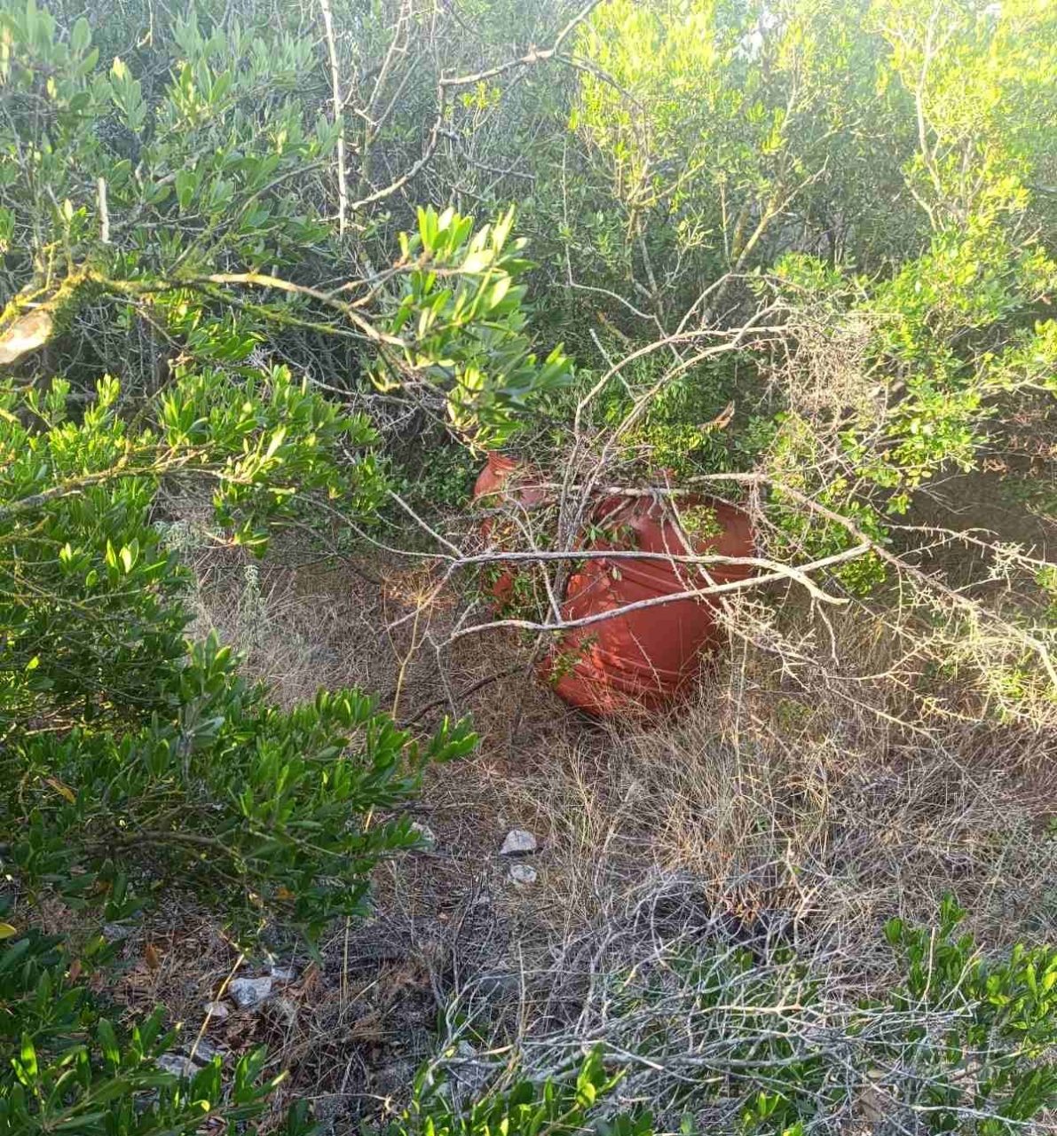 Κατά τη διάρκεια της εξερεύνησης, οι αστυνομικοί εντόπισαν δύο μεγάλα πλαστικά δοχεία, επιμελώς κρυμμένα με κλαδιά και χόρτα από τη γύρω βλάστηση, τα οποία περιείχαν συνολικά 21 συσκευασίες με άνισες ποσότητες ακατέργαστης κάνναβης (φούντα), συνολικού βάρους 24 κιλών και 119 γραμμαρίων.