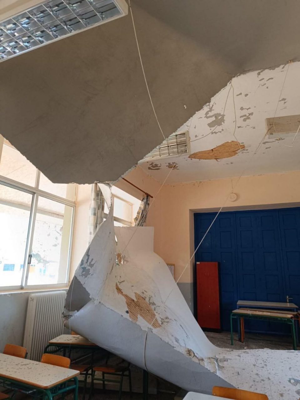 Μέρος της οροφής αίθουσας του 1ου Δημοτικού Σχολείου Φιλιατρών κατέρρευσε την περασμένη Τρίτη, αργά το μεσημέρι, ευτυχώς σε ώρα που δεν λειτουργούσε το σχολείο, χωρίς να δημιουργηθεί κάποιο θέμα με τους μαθητές και τους εκπαιδευτικούς που δεν βρίσκονταν εκείνη τη στιγμή στην αίθουσα.
