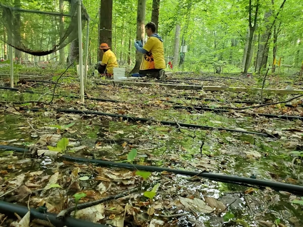 Το πείραμα της ομάδας του Δρα. Μεγκόνιγκαλ προσομοιώνει τις επιπτώσεις των καταιγίδων ψεκάζοντας θαλασσινό νερό σε τεμάχια σε παράκτια δάση. Μεταφέρει αλμυρό νερό από τον κοντινό κόλπο Chesapeake σε δεξαμενές και στη συνέχεια το ψεκάζει στην επιφάνεια του εδάφους για περίπου 10 ώρες κάθε φορά. Αυτό προσομοιώνει ένα κύμα αλμυρού νερού κατά τη διάρκεια μιας μεγάλης καταιγίδας.