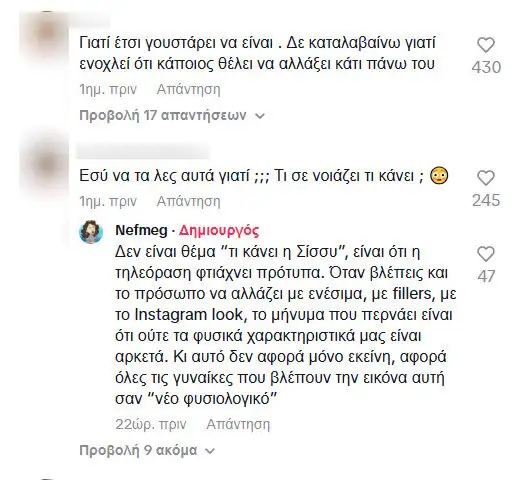 Σε σχόλια follower, η Νεφέλη Μεγκ απάντησε: «Δεν είναι θέμα “τι κάνει η Σίσσυ”, είναι ότι η τηλεόραση φτιάχνει πρότυπα. Όταν βλέπεις και το πρόσωπο να αλλάζει με ενέσιμα, με fillers, με το Instagram look, το μήνυμα που περνάει είναι ότι ούτε τα φυσικά χαρακτηριστικά μας είναι αρκετά. Κι αυτό δεν αφορά μόνο εκείνη, αφορά όλες τις γυναίκες που βλέπουν την εικόνα αυτή σαν “νέο φυσιολογικό”».