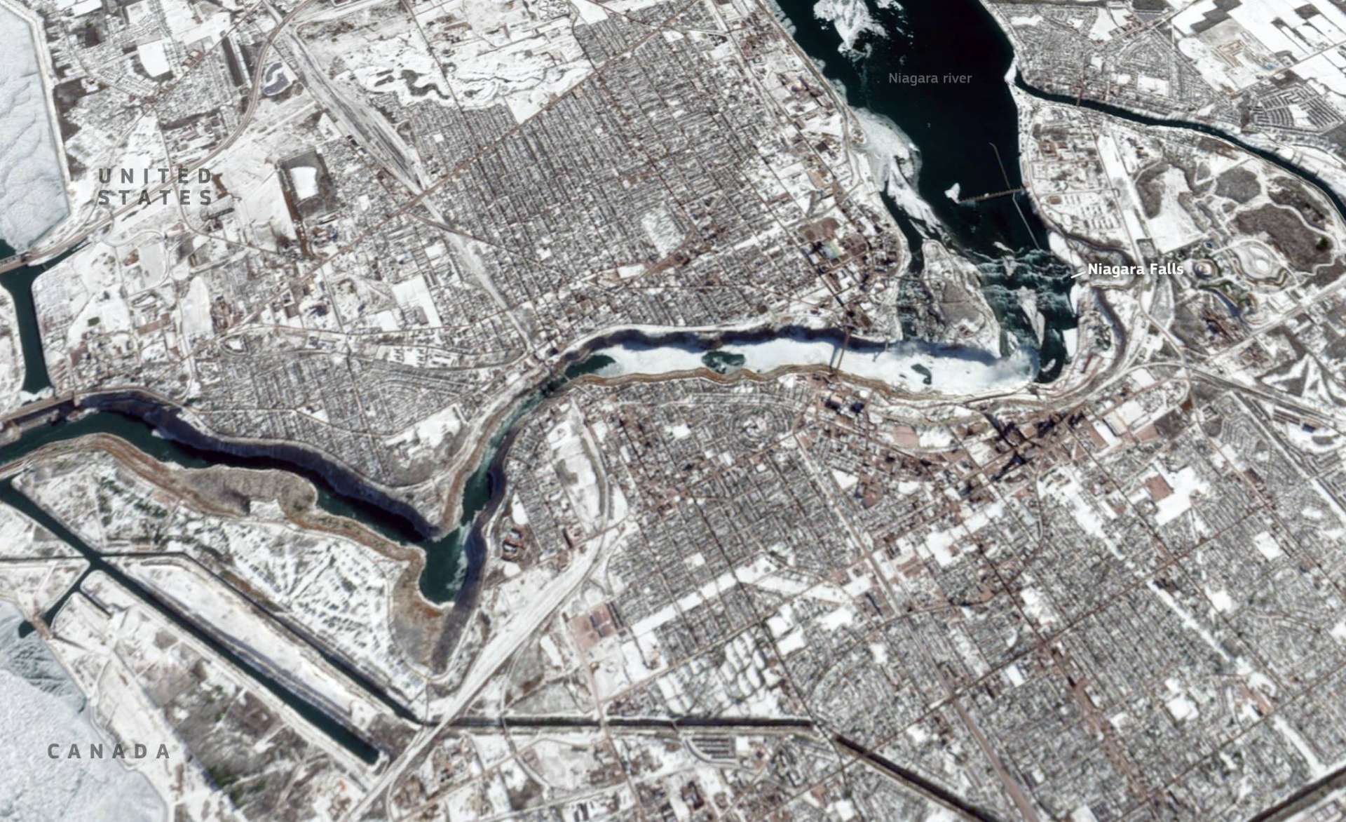 Μερικώς παγωμένοι φαίνονται από ψηλά στην εικόνα του Copernicus Sentinel-2 οι καταρράκτες του Νιαγάρα. Το στιγμιότυπο κατεγράφη προ ημερών (στις 27/1).