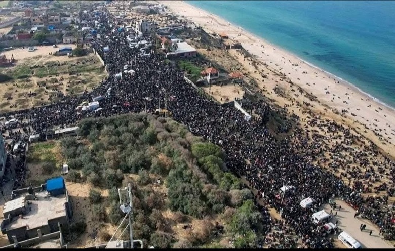 Tens of thousands of Palestinians at the Netzarim Corridor in central Gaza