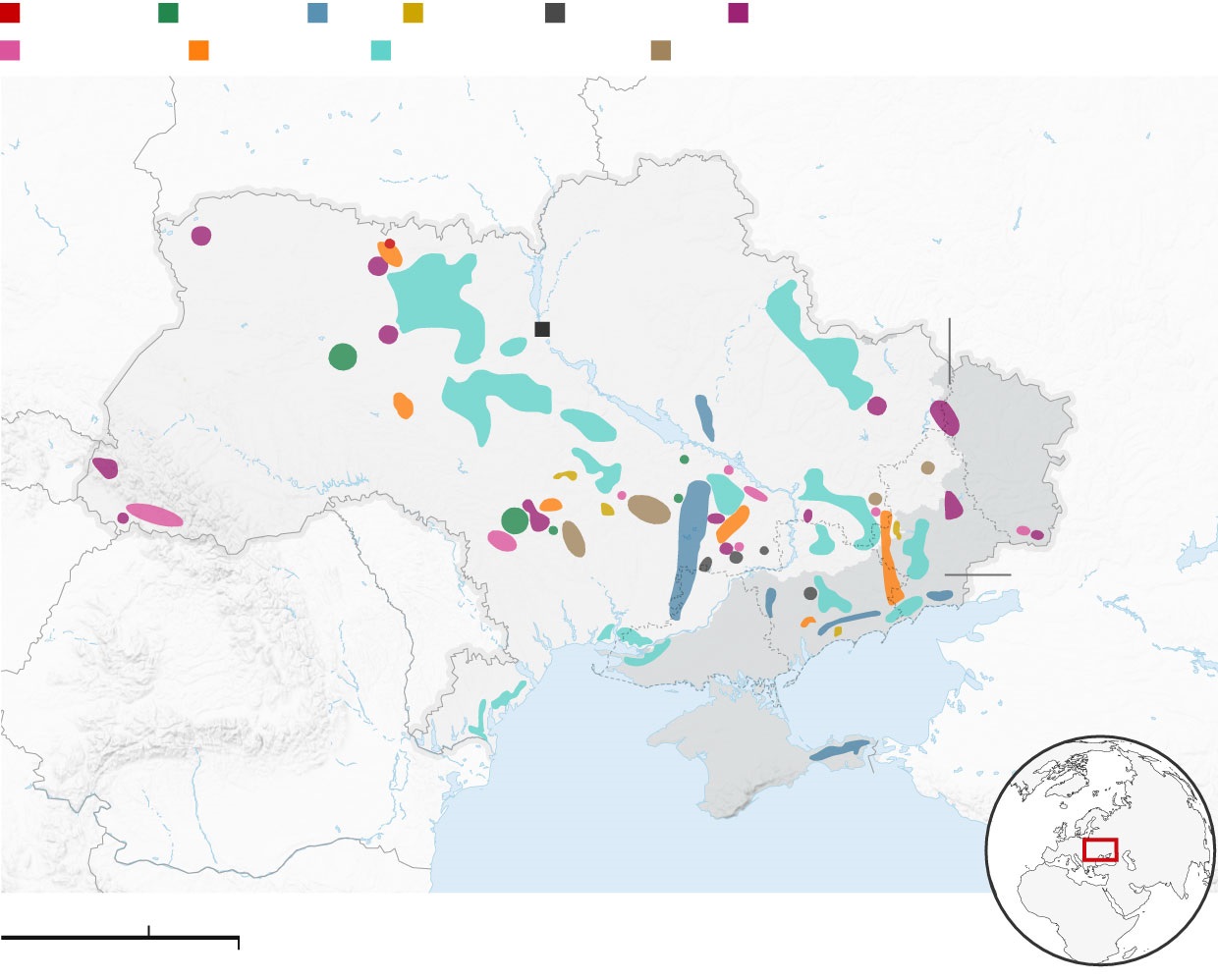Στον χάρτη της Ουκρανίας οι σπάνιες γαίες εμφανίζονται με κόκκινο και πορτοκαλί, το ουράνιο με καφέ χρώμα, το λίθιο με κιτρινωπό, το τιτάνιο με τιρκουάζ και ο σίδηρος με μπλε.