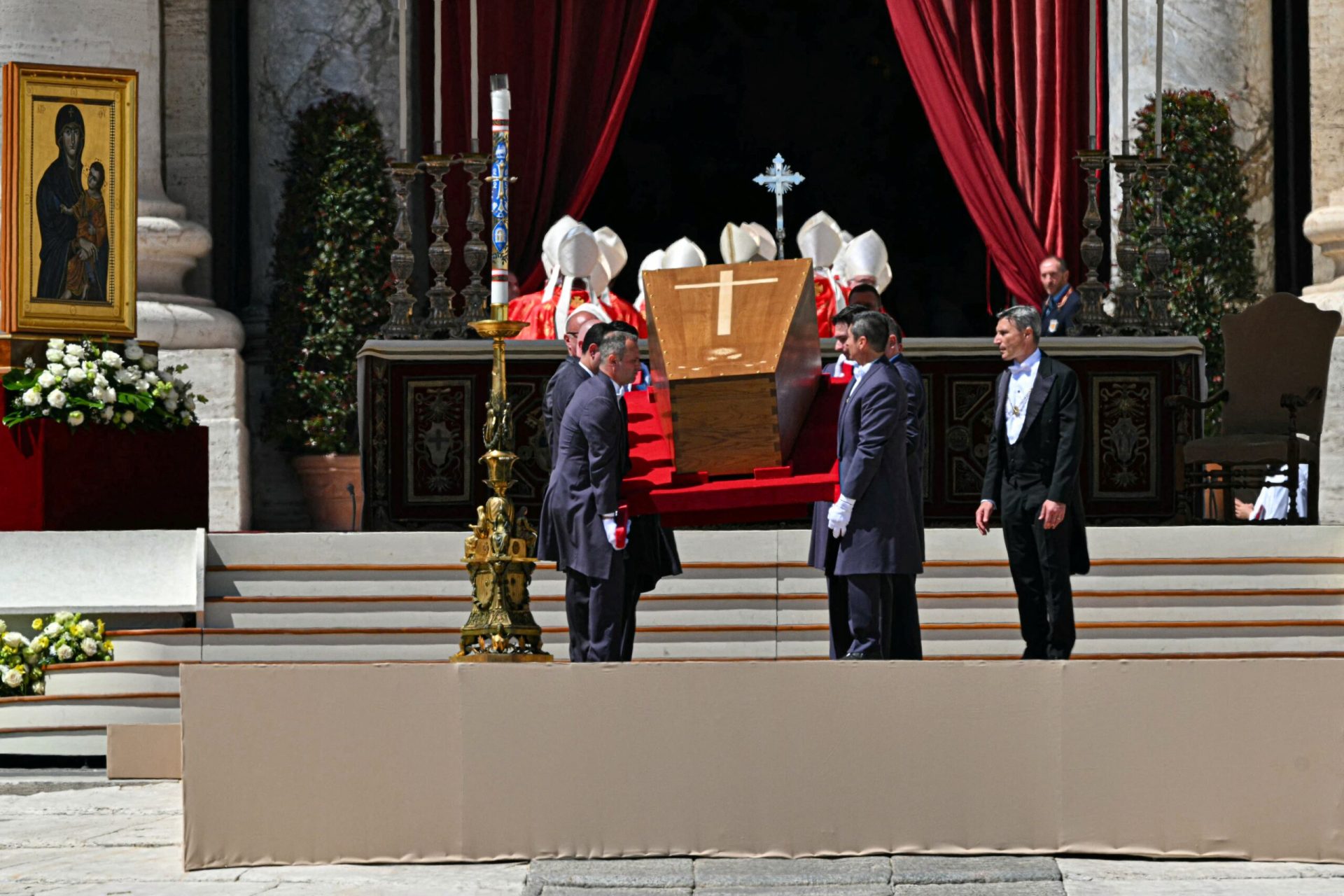 Καθώς χτυπούσαν οι καμπάνες, οι συνοδοί έφεραν το φέρετρο μπροστά από αρκετές δεκάδες μετανάστες, φυλακισμένους και άστεγους που κρατούσαν λευκά τριαντάφυλλα έξω από τη βασιλική. Μόλις μπήκαν μέσα, οι ίδιοι σταμάτησαν μπροστά στην εικόνα της Παναγίας για την οποία φημίζεται η εκκλησία και την οποία ο Φραγκίσκος σεβόταν βαθιά. Τέσσερα παιδιά άφησαν τριαντάφυλλα στην εικόνα πριν αρχίσει η τελετή ταφής.