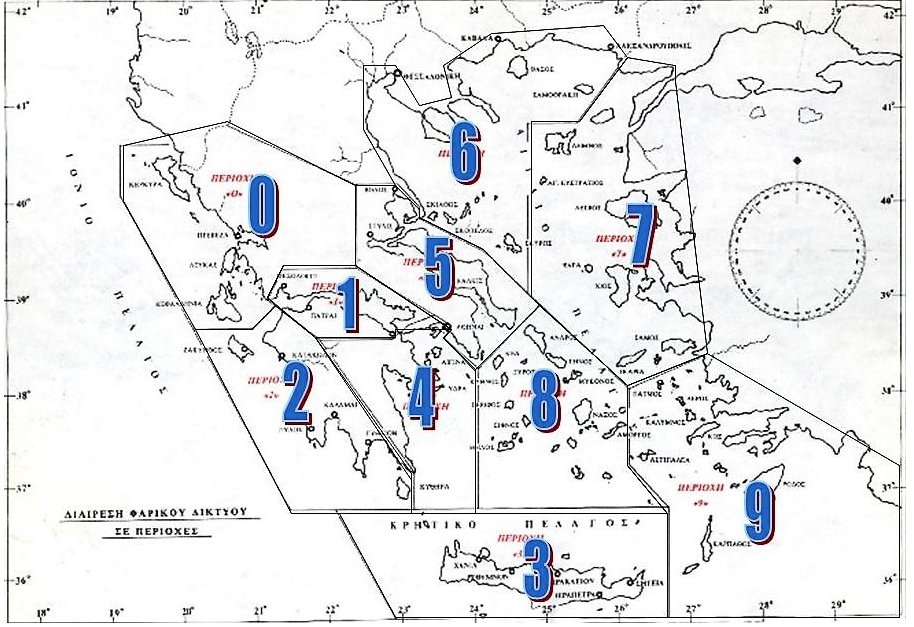 Το Ελληνικό Φαρικό δίκτυο έχει διαιρεθεί σε 10 περιοχές που χαρακτηρίζονται με τους αριθμούς από 0 μέχρι 9, όπως φαίνεται στον χάρτη που ακολουθεί παρακάτω. Σκοπός αυτής της διαίρεσης είναι ο άμεσος προσδιορισμός της γενικότερης γεωγραφικής θέσης στην οποία βρίσκεται ένας πυρσός, όταν αυτός αναφέρεται με τον Εθνικό Αριθμό του ή συντομογραφικά ΑΕΦ του πυρσού.