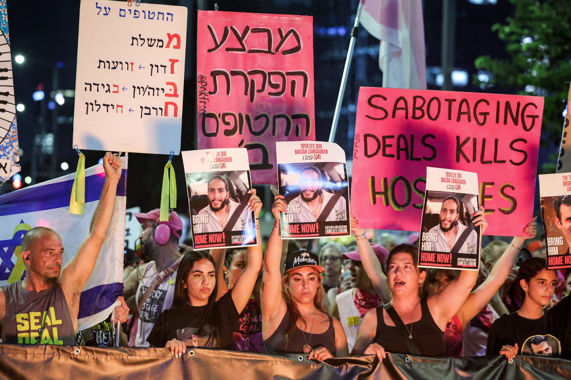 Την ίδια ώρα δεκάδες χιλιάδες Ισραηλινοί διαδήλωσαν, όπως κάθε Σάββατο βράδυ, στο Τελ Αβίβ ζητώντας από την κυβέρνηση τον τερματισμό του πολέμου και μια συμφωνία για την απελευθέρωση των ομήρων.