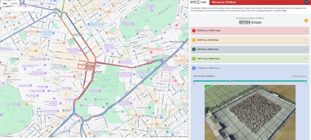 Εφαρμογή που ανέπτυξε το iMEdD, η οποία εκτιμά τον αριθμό των ατόμων σε μια καθορισμένη περιοχή στον χάρτη, υπολόγισε το πλήθος που συγκεντρώθηκε σήμερα στο Σύνταγμα για τη διαδήλωση με αφορμή τα δύο χρόνια από το δυστύχημα στα Τέμπη.