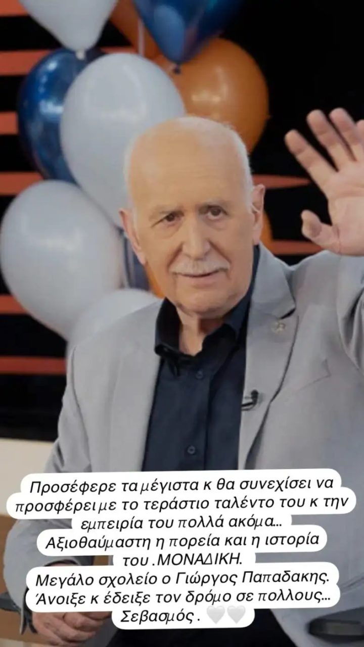 «Προσέφερε τα μέγιστα και θα συνεχίσει να προσφέρει με το τεράστιο ταλέντο του και την εμπειρία του πολλά ακόμα… Αξιοθαύμαστη η πορεία και η ιστορία του. ΜΟΝΑΔΙΚΗ. Μεγάλο σχολείο ο Γιώργος Παπαδάκης. Άνοιξε κ έδειξε τον δρόμο σε πολλούς… Σεβασμός» έγραψε η Ρούλα Κορομηλά.