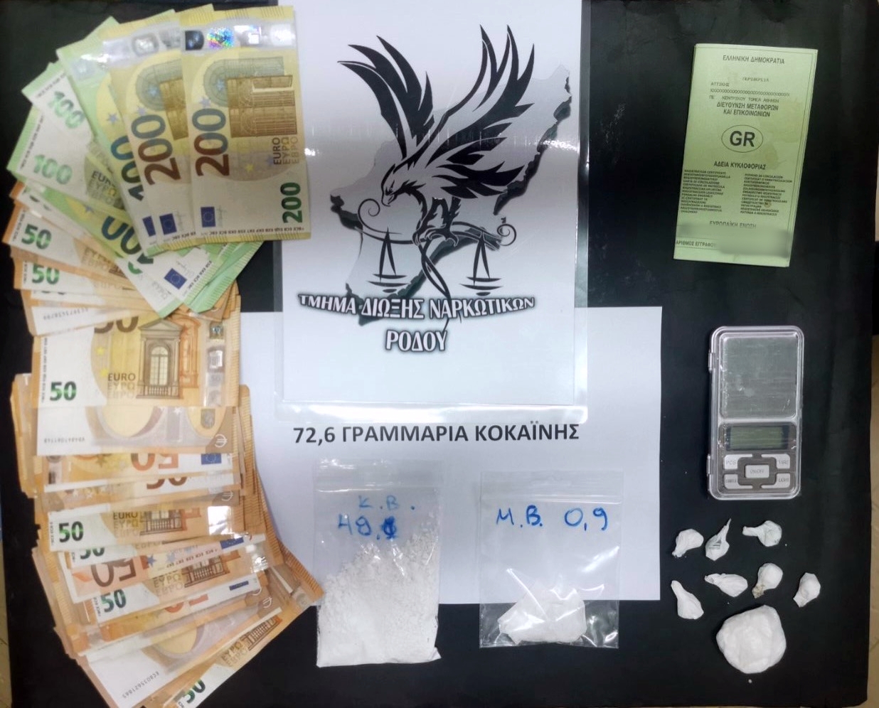 - Κοκαΐνη, συνολικού βάρους 72,6 γραμμαρίων (εκ των οποίων τα 7γραμμ. μοιρασμένα σε 7 ισομερείς συσκευασίες, έτοιμες προς διακίνηση)