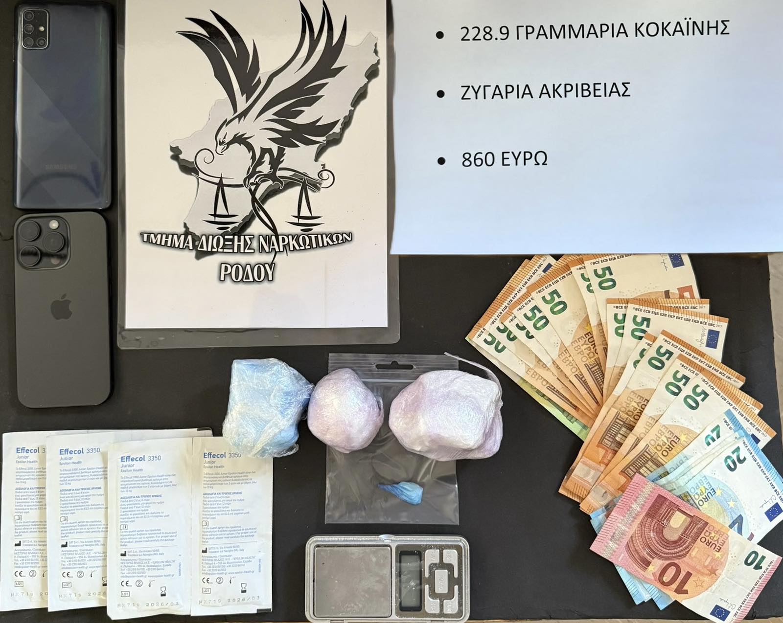 - 229 γραμμάρια κοκαΐνη (μοιρασμένη σε 3 συσκευασίες)