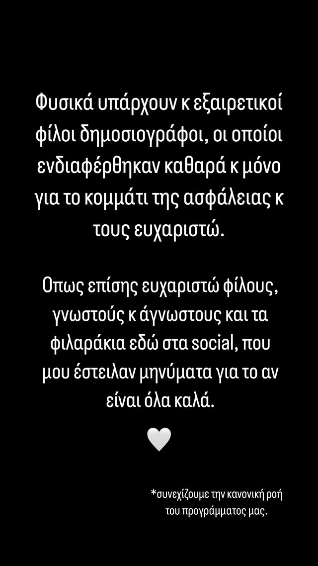 «Θα μπορούσα να πω πάρα πολλά για χθες, αλλά δεν θα πω τίποτα. Δεν έχει κανένα νόημα γιατί αυτό που συνέβη, συμβαίνει σε πάρα πολύ κόσμο, δεν είμαι κάτι διαφορετικό. Ωστόσο, ήταν η χαρά του δημοσιογράφου. Τα τηλέφωνα δεν σταμάτησαν να χτυπάνε, τα μηνύματα, όλα. Μου έλεγαν “σε παρακαλώ πες μας, μην βγεις αλλού, βγες σε εμάς”.