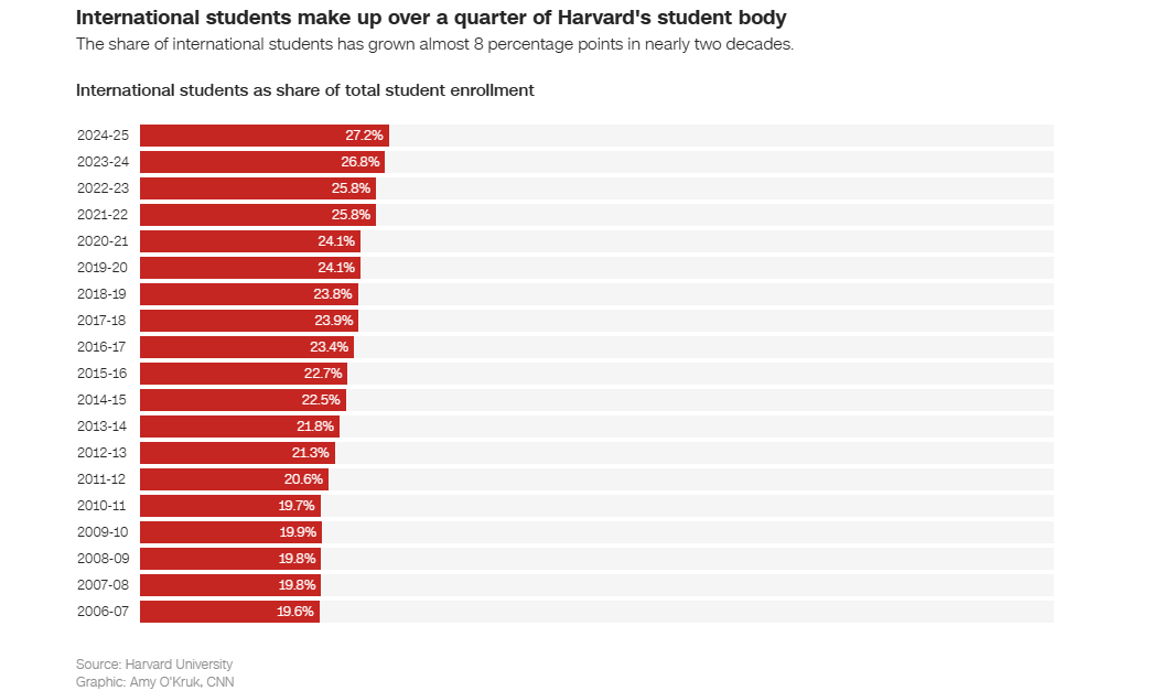 Το Υπουργείο Εσωτερικής Ασφάλειας των Ηνωμένων Πολιτειών επέβαλε τον τερματισμό της πιστοποίησης του Προγράμματος Φοιτητών και Επισκεπτών Ανταλλαγής του πανεπιστημίου Χάρβαρντ, απαγορεύοντας με εμπάργκο στη φιλοξενία ξένων φοιτητών, οι οποίοι αποτελούν πάνω από το ένα τέταρτο του φοιτητικού πληθυσμού.