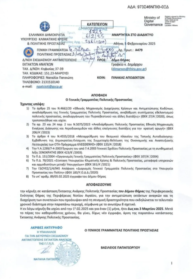 Το υπουργείο Κλιματικής Κρίσης και Πολιτικής Προστασίας αποφάσισε ο δήμος Θήρας να τεθεί σε κατάσταση έκτακτης ανάγκης λόγω των συνεχών σεισμών που καταγράφονται μεταξύ Σαντορίνης και Αμοργού.