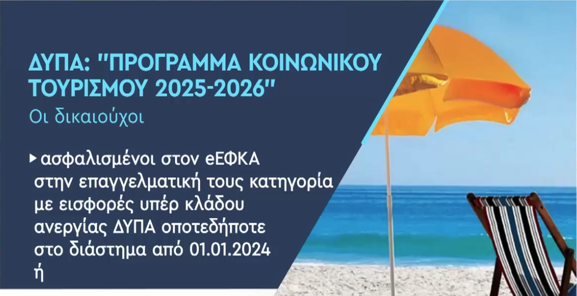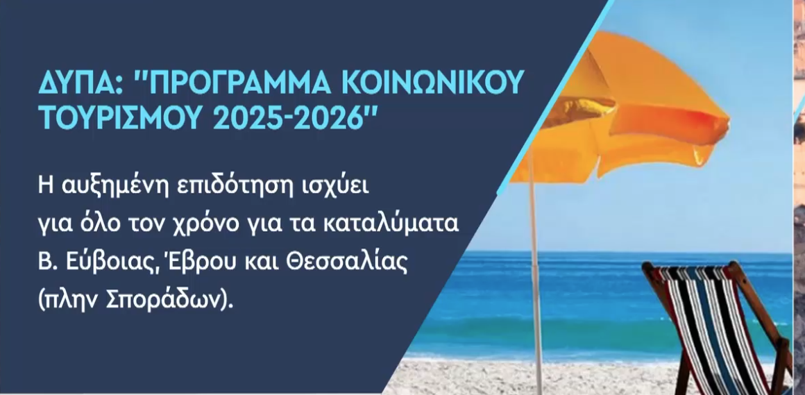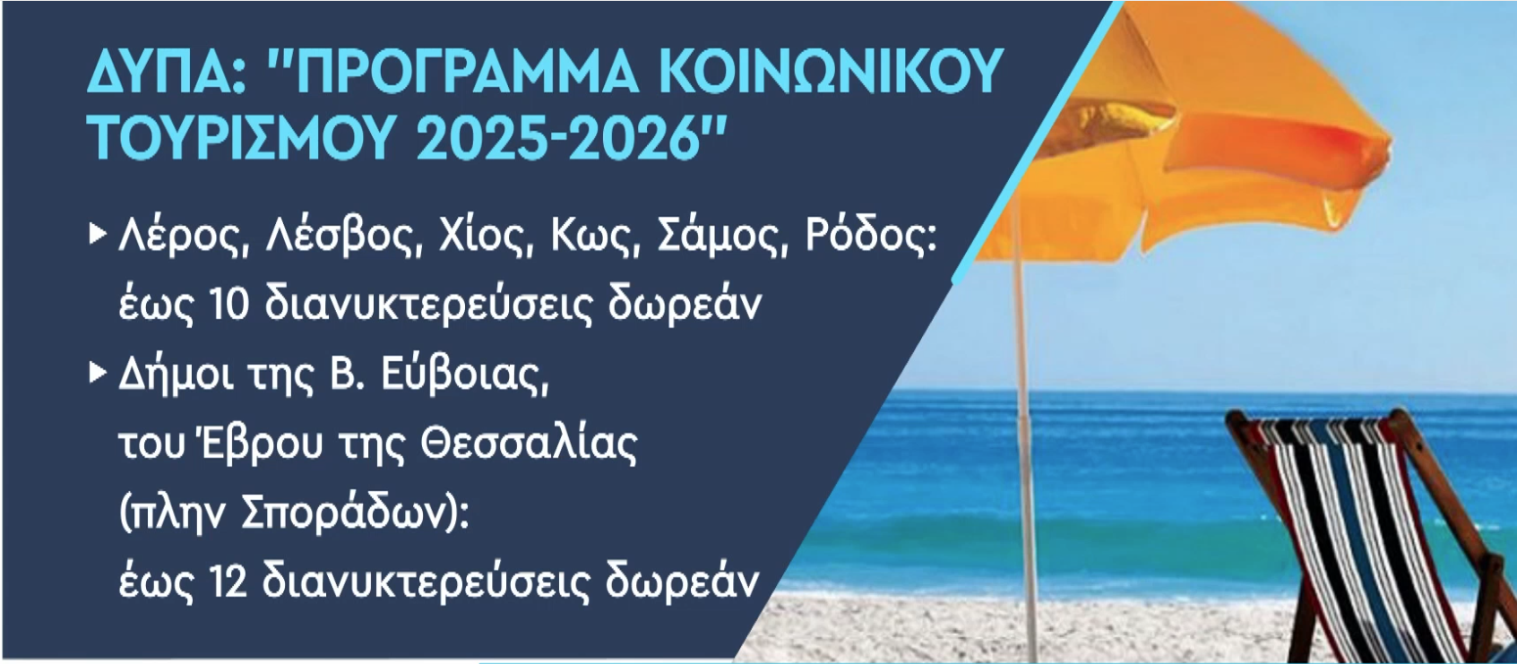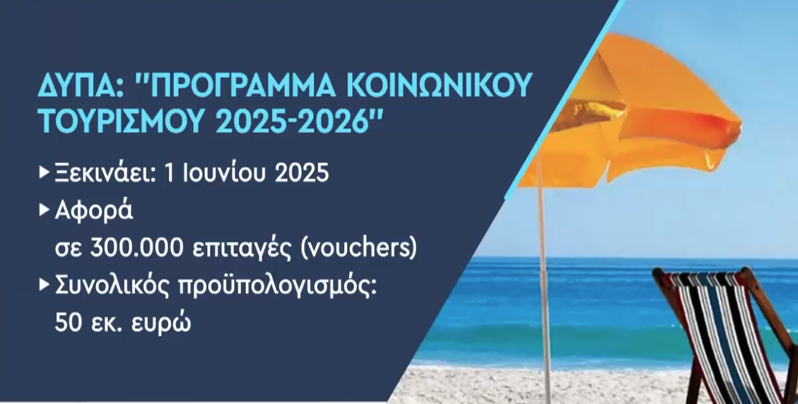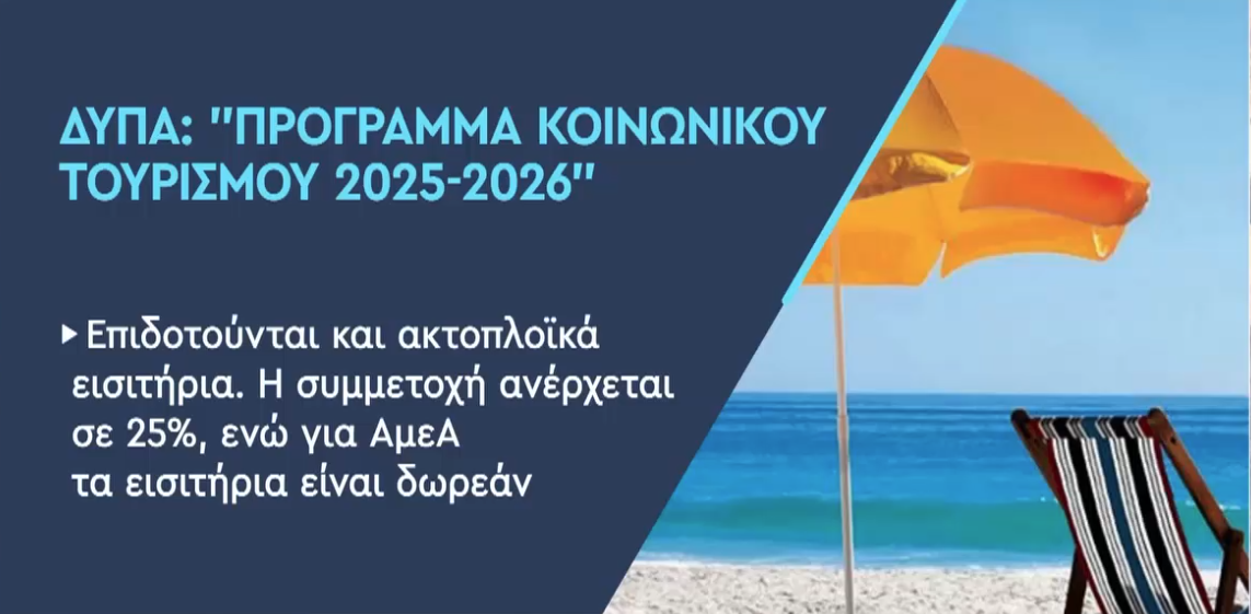 «Επιδοτούνται και τα ακτοπλοϊκά εισιτήρια. Η συμμετοχή είναι μόνο 25%, ενώ για άτομα με αναπηρία είναι 100% καλυμμένη από τη ΔΥΠΑ», εξήγησε στους δημοσιογράφους της εκπομπής Κατερίνα Δούκα και Κώστα Παπαχλιμίντζο. Μετά την έγκριση, ο δικαιούχος, όπως είπε, θα πρέπει να κλείσει τις διακοπές του επιλέγοντας κατάλυμα από το Μητρώο Παρόχων.