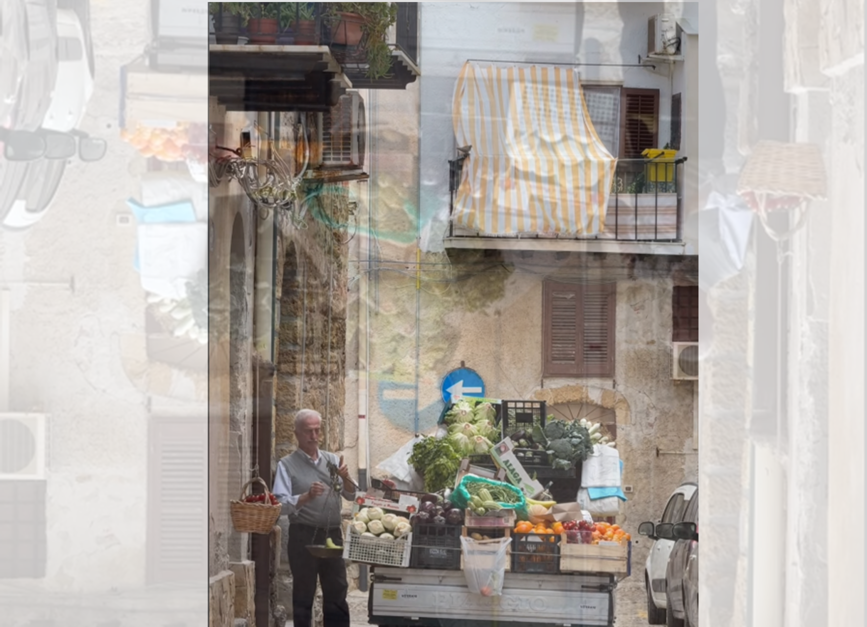 Στη Σικελία, οι μικρές στιγμές αποκτούν νόημα. Ο μαναβης που μοιράζει φρέσκα λαχανικά και φρούτα με το καλάθι και το σχοινί δεν μεταφέρει μόνο προϊόντα, αλλά κι ένα κομμάτι παλιάς, «ζεστής» ζωής.