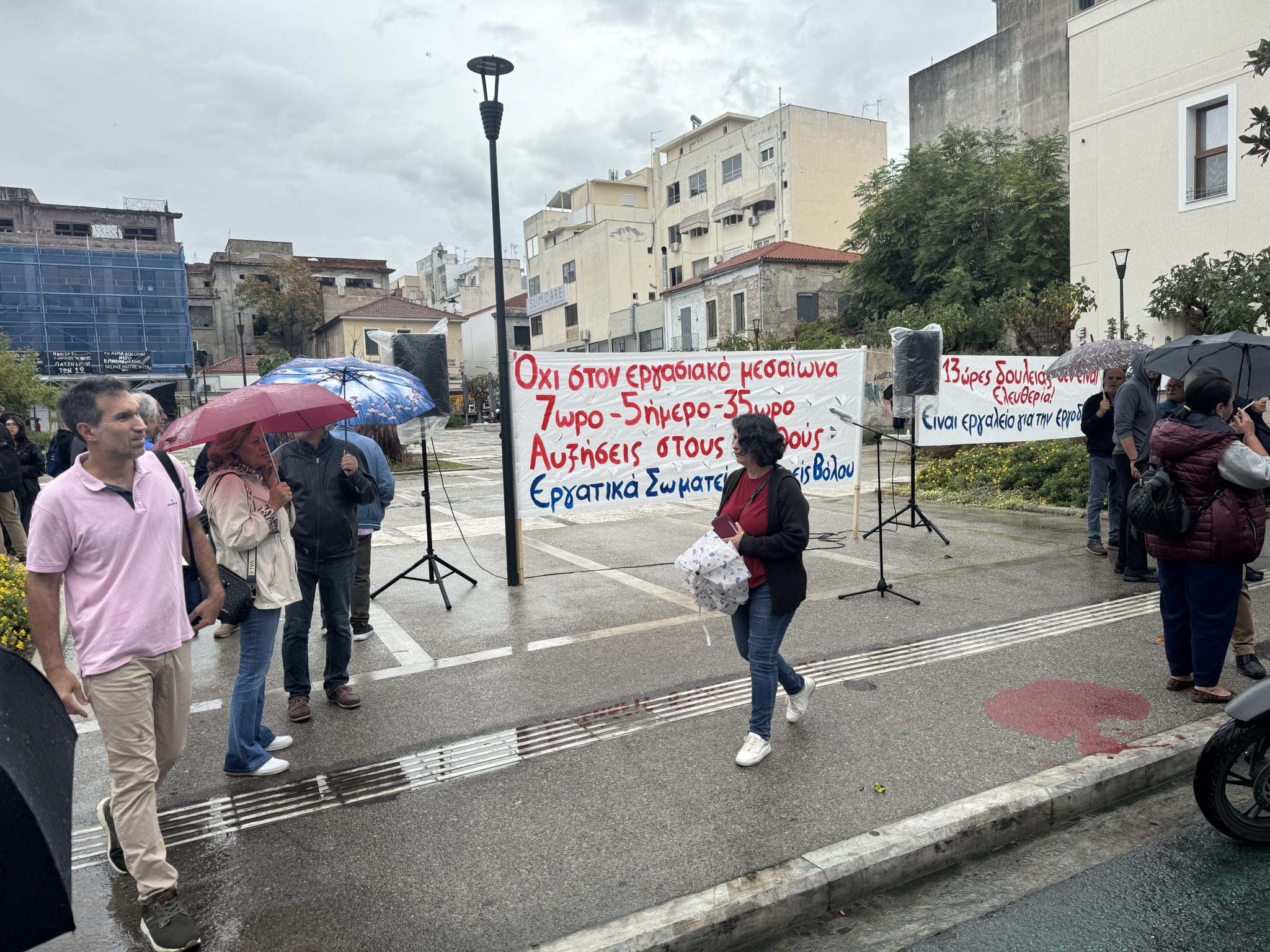Ο Παναγιώτης Τσιτσιρίκης, πρόεδρος του Συνδέσμου Υπαλλήλων Βόλου και μέλος της διοίκησης του Εργατικού Κέντρου Βόλου, τόνισε ότι «με τη σημερινή μας απεργία θέλουμε να στείλουμε το μήνυμα απέναντι σε κυβερνήσεις, εργοδοσία και τα παπαγαλάκια τους, ότι οι ρυθμοί ανάπτυξης δεν είναι οι ανάγκες μας». Όπως ανέφερε, «το νομοσχέδιο φέρνει επίσημα το 13ωρο, ενώ ήδη στους χώρους δουλειάς εφαρμόζονται πρακτικές που καταπατούν βασικά δικαιώματα, όπως συνεχόμενες άδειες». Ο ίδιος κατηγόρησε τη ΓΣΕΕ και την πλειοψηφία του Εργατικού Κέντρου Βόλου ότι «στηρίζουν τις ευρωπαϊκές οδηγίες που χτυπούν τους εργαζόμενους», καλώντας τους εργαζόμενους να οργανωθούν στα σωματεία και να «στείλουν το νομοσχέδιο στα σκουπίδια».