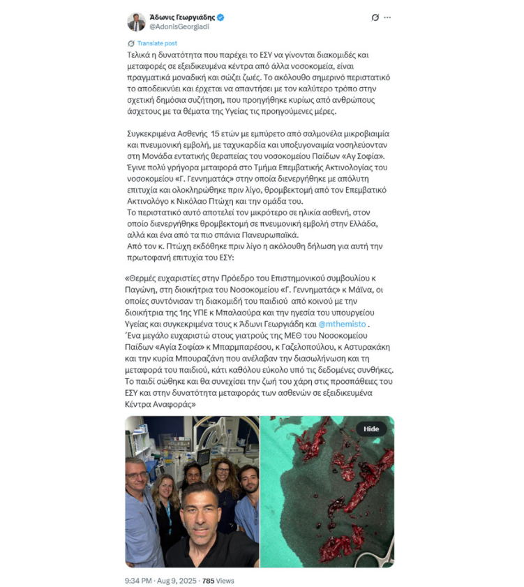 Όπως αναφέρει σε ανάρτησή του στο Χ ο κ. Γεωργιάδης, η 15χρονη «αποτελεί τον μικρότερο σε ηλικία ασθενή, στον οποίο διενεργήθηκε θρομβεκτομή σε πνευμονική εμβολή στην Ελλάδα, αλλά και ένα από τα πιο σπάνια Πανευρωπαϊκά».