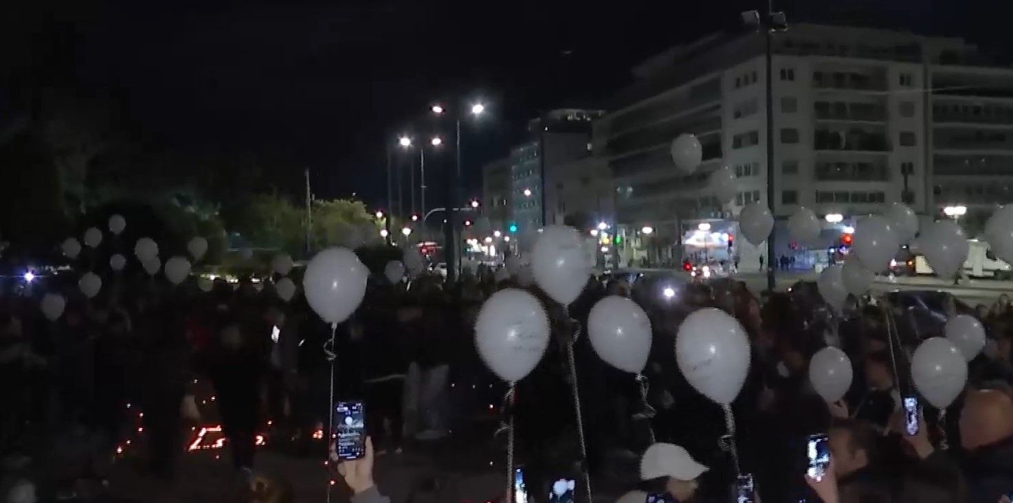 Στις 23:18 το βράδυ της Παρασκευής, μετά τα μεγαλειώδη συλλαλητήρια για τη συμπλήρωση δύο χρόνων από την μαύρη επέτειο των Τεμπών, πλήθος συγκεντρωμένο έξω από τη Βουλή στο Σύνταγμα, αφήνει 57 μπαλόνια με τις ηλικίες και τα ονόματα των νεκρών να φύγουν στον αττικό ουρανό.
