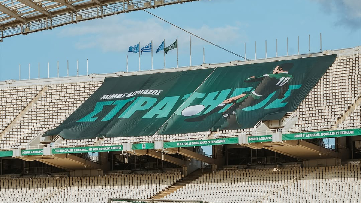 Στο ΟΑΚΑ λοιπόν βρίσκεται ένα μεγάλο πανό με την μορφή του Δομάζου και το μήνυμα: «Μίμης Δομάζος ΣΤΡΑΤΗΓΟΣ», ενώ στο πάνω διάζωμα υπάρχουν αρκετά ακόμα μικρότερα.